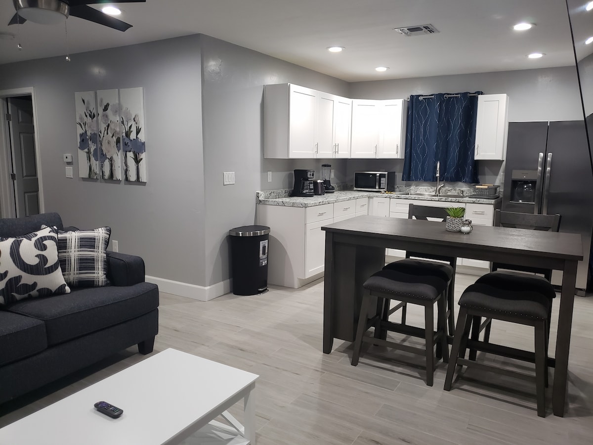 Idéal pour les groupes de 1 à 4 personnes. N'hésitez pas à consulter les autres annonces sur mon profil. À 10 minutes de l'aéroport Sky Harbor, vous n'aurez aucun mal à prendre un vol tôt le matin. Uber/Lyft vers/depuis l'aéroport coûte généralement de 7 à 15 $. Le code postal est le 85040 pour référence. Comprend une télévision connectée, une kitchenette et une salle de bain privée.