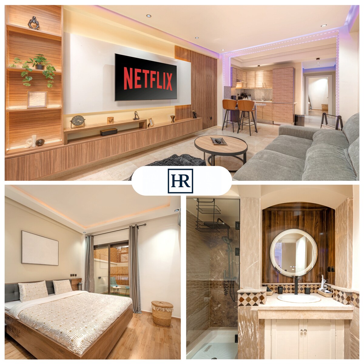Bienvenue au PALACE SUITES I, un havre moderne au cœur de Guéliz. Profitez d’une chambre élégante avec placard, home cinéma et Netflix, d’un salon design avec TV 65’’ IPTV, d’une cuisine entièrement équipée, d’une salle de bain complète et d’une terrasse communicante offrant une vue magnifique. À seulement 2 minutes à pied de la gare et de la Marrakech Plaza, vivez une expérience alliant luxe, confort et détente absolue. 🌇✨