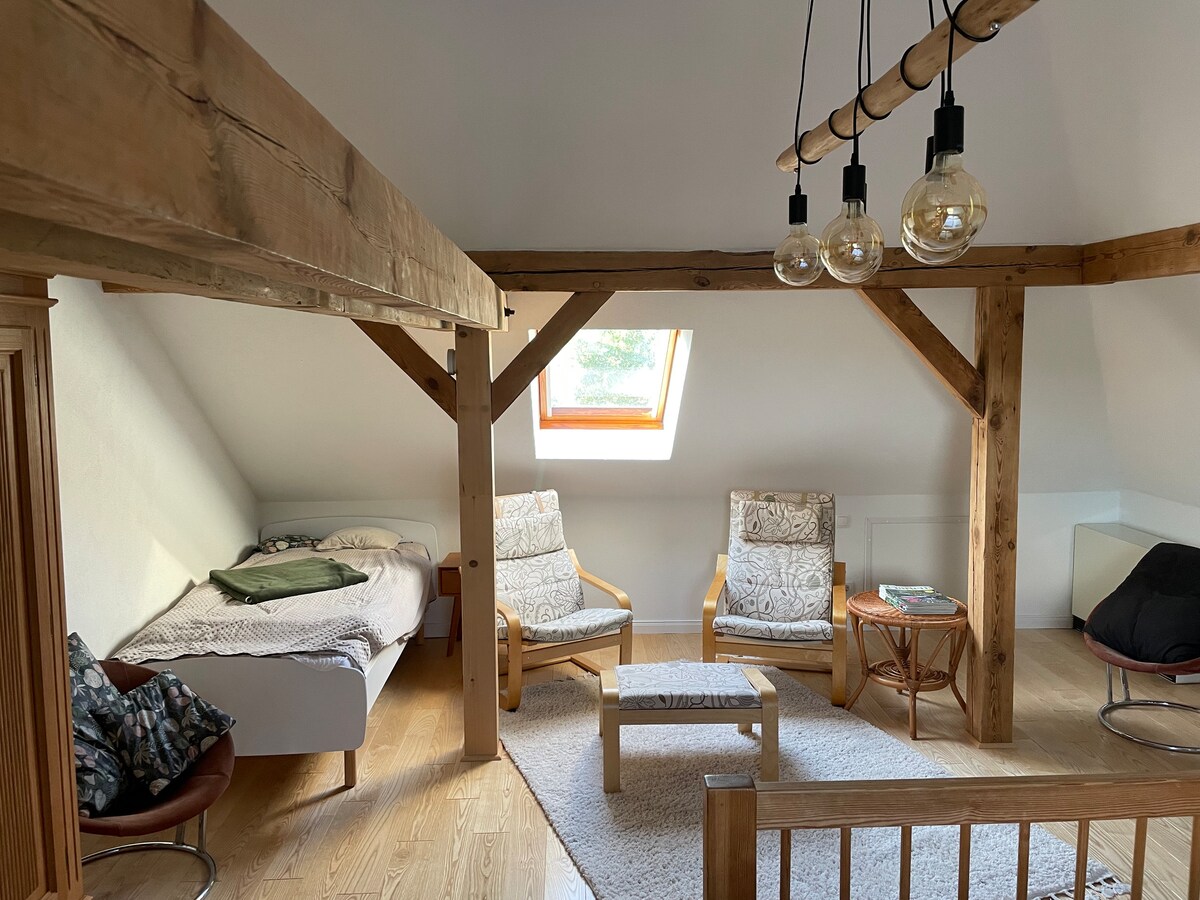 ... regardez de votre lit sur l'eau, profitez du calme et de la tranquillité et écoutez le bruissement de la forêt de hêtres, faites des excursions à vélo directement sur l'eau et profitez de la nature. Une belle maison à colombages moderne et rustique à faible consommation d'énergie avec toit de chaume, carreaux marocains, planchers de chêne et murs en plâtre d'argile vous attend. Pour les activités, il y a un beau grand jardin avec une balançoire dans la forêt, un sauna à vapeur gratuit, une douche et une baignoire extérieures, une planche de paddle, un pédalo et 4 vélos.