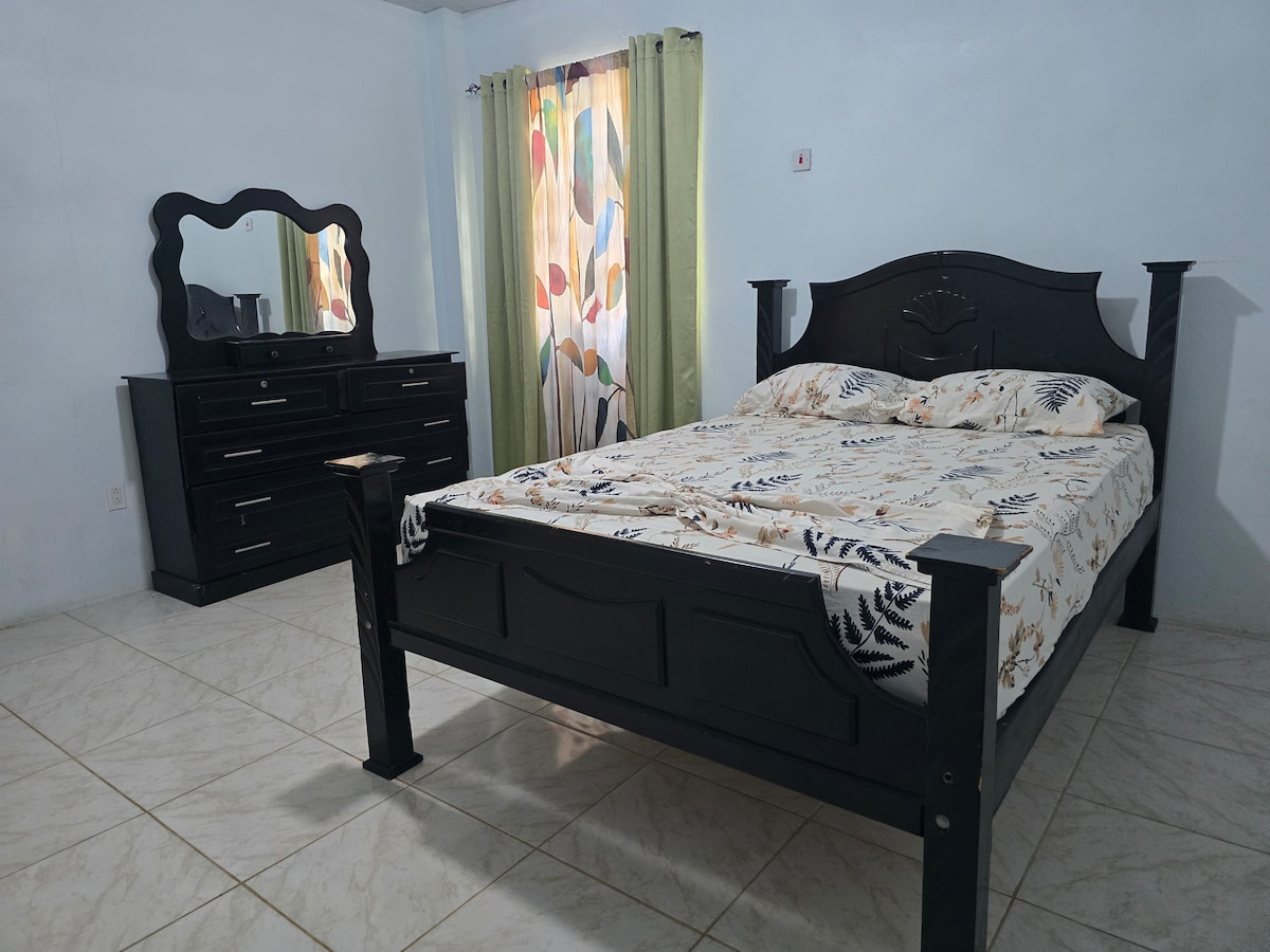 Détendez-vous dans cet appartement lumineux et moderne de 2 chambres idéal pour les familles, les amis ou les affaires. Les deux chambres offrent des lits king size confortables avec un espace de rangement. Peut accueillir jusqu'à 4 personnes avec une cuisine entièrement équipée, un salon ouvert, une télévision connectée, une connexion Wi-Fi rapide et une buanderie dans l'appartement. Profitez d'un patio privé et d'un parking gratuit. Situé à seulement 9 minutes du marché de Skeldon et du parc récréatif de Skeldon, à 40 minutes du service de ferry de Suriname.