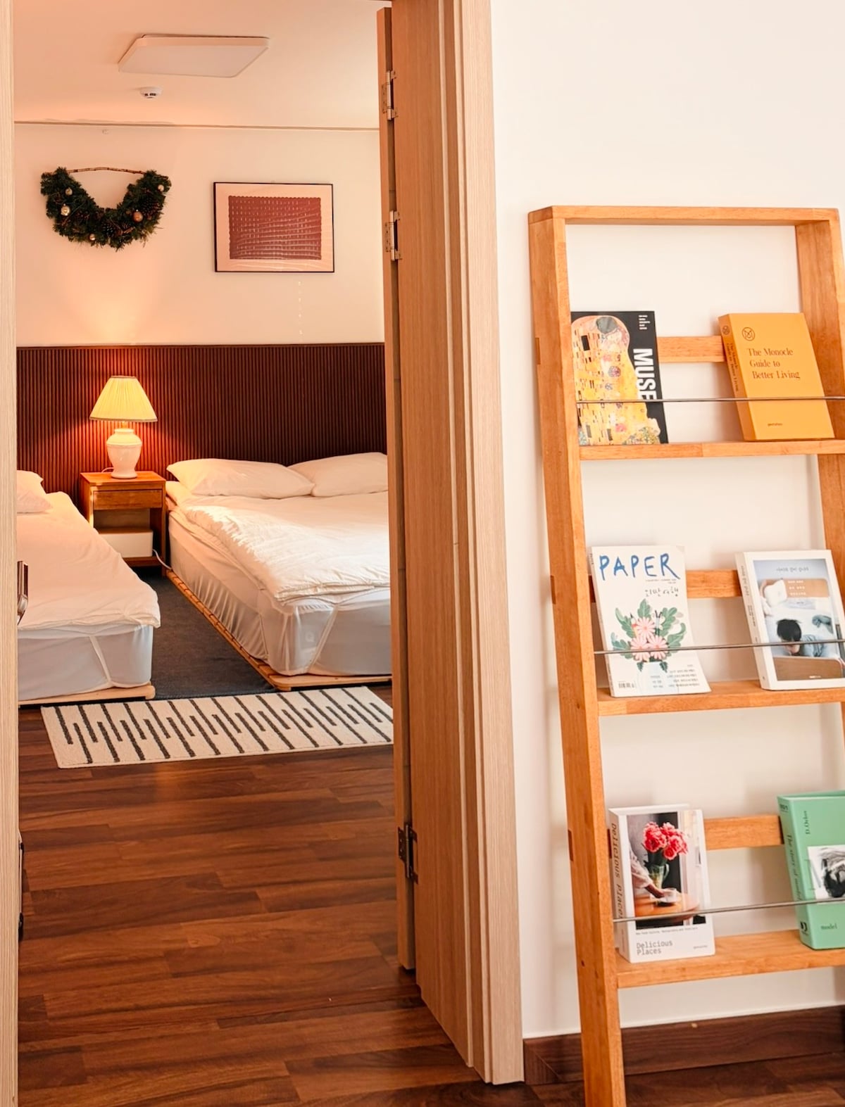 세계문화유산 화성행궁의 중심 행리단길 중심부에 자리하여 입지적 편리함과 세련된 스타일을 모두 갖춘 공간입니다. 감성적인 인테리어로 꾸며진 공간을 여유롭게 이용하실수 있으며 장박문의 가족단위 환영합니다:) 숙소의 모든 침구류는 고온 건조로 살균처리하여 매일 교체합니다. * 기준인원은 4인, 최대 6인까지 가능합니다. (추가요금 있음, 6인이상 시 사전 문의 필수) ⭐️체크인16시/체크아웃12시 🏠 방2, 침대3, 욕실1 쾌적하고 깨끗한 침실에서 온전한 휴식을 누리세요. *침실1 - 퀸사이즈 침대2, 행거, 화장대, TV, 간접 조명, 거울, 고데기, 멀티충전기 등 *침실2- 퀸사이즈 침대1, 소파, 테이블, 간접 조명, 벽행거 *거실 스마트티비로 음악을 감상하거나 넷플릭스, 유튜브를 이용하며 즐거운 시간을 보낼 수 있습니다. (넷플릭스 무료) (스마트TV, 전신거울, 다이닝테이블, 의자 등)