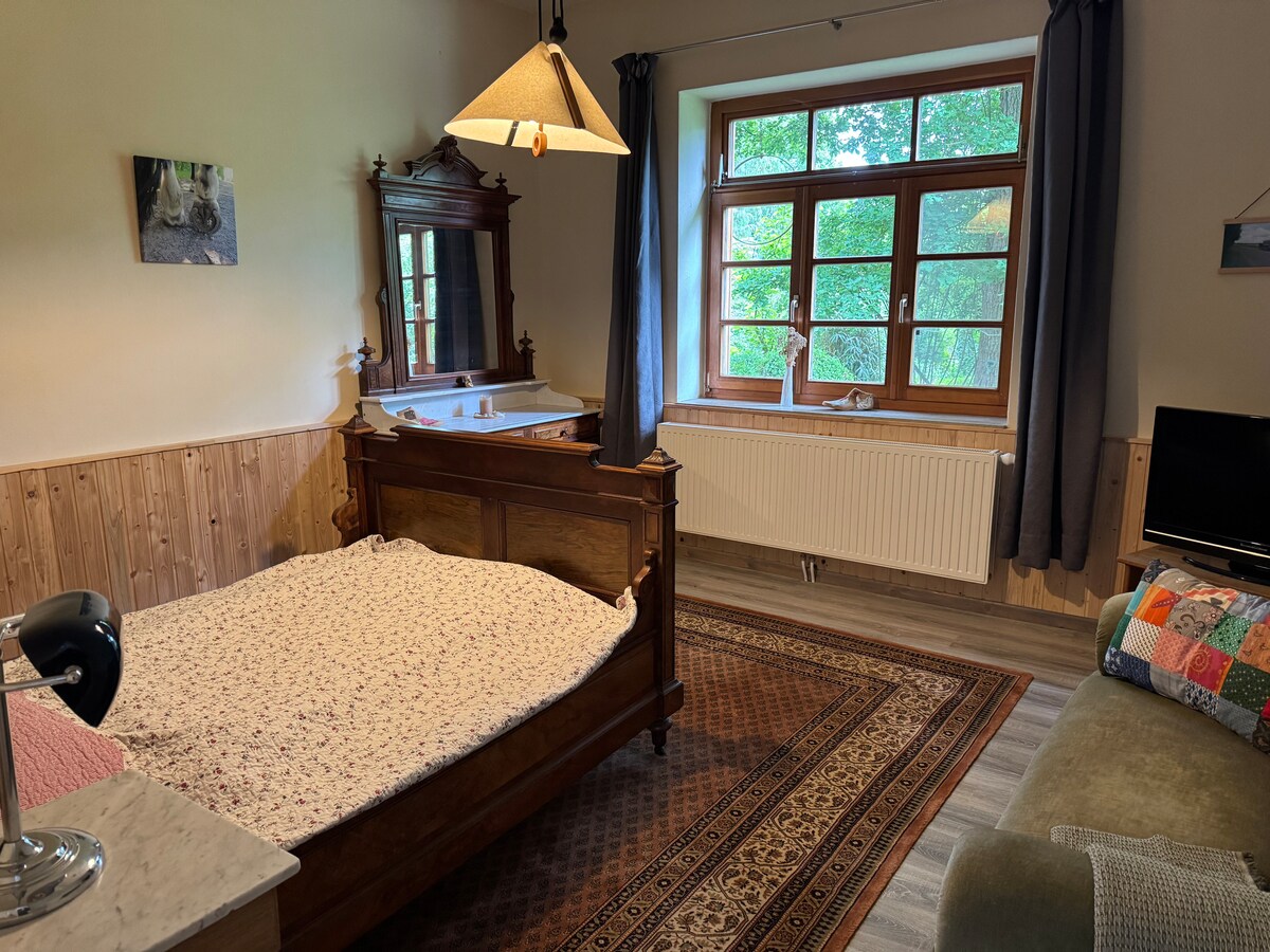 Nous avons transformé un appartement de notre maison de campagne en un logement de vacances. Nous louons deux chambres dans un appartement séparé avec une cuisine-salle à manger et une salle de bains. Il y a aussi un jardin fleuri avec un étang et de nombreux coins enchantés. Sur la terrasse se trouve un brasero. L'une des chambres dispose d'un grand lit double et de deux lits simples, l'autre de deux lits. La cuisine spacieuse invite à des heures conviviales. Toutes les pièces sont spacieuses.