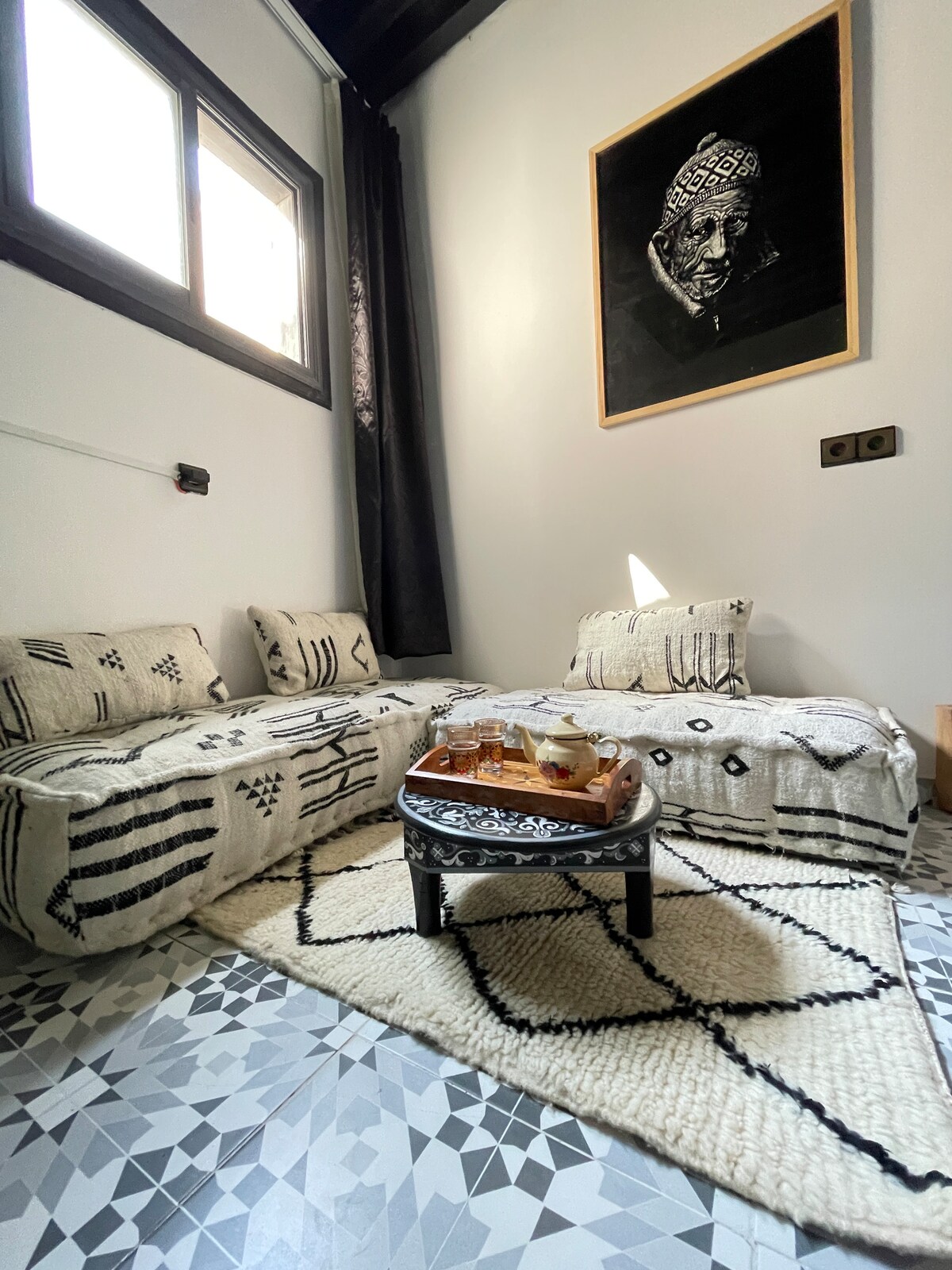 Cet appartement récemment ouvert dans l'ancienne médina offre une vue imprenable sur l'océan et une spacieuse chambre ensoleillée de 30 m², vous invitant à vous détendre avec l'énergie paisible de l'océan. Au rez-de-chaussée, vous trouverez une salle de session musicale animée où des musiciens locaux et itinérants se réunissent pour jouer, un endroit idéal pour les amateurs de musique et de culture. Nous parlons anglais,français,arabe,japonais À 1 minute à pied de la muraille historique de la ville et à 6 minutes de la place principale où la scène du Festival Gnaoua prend vie.