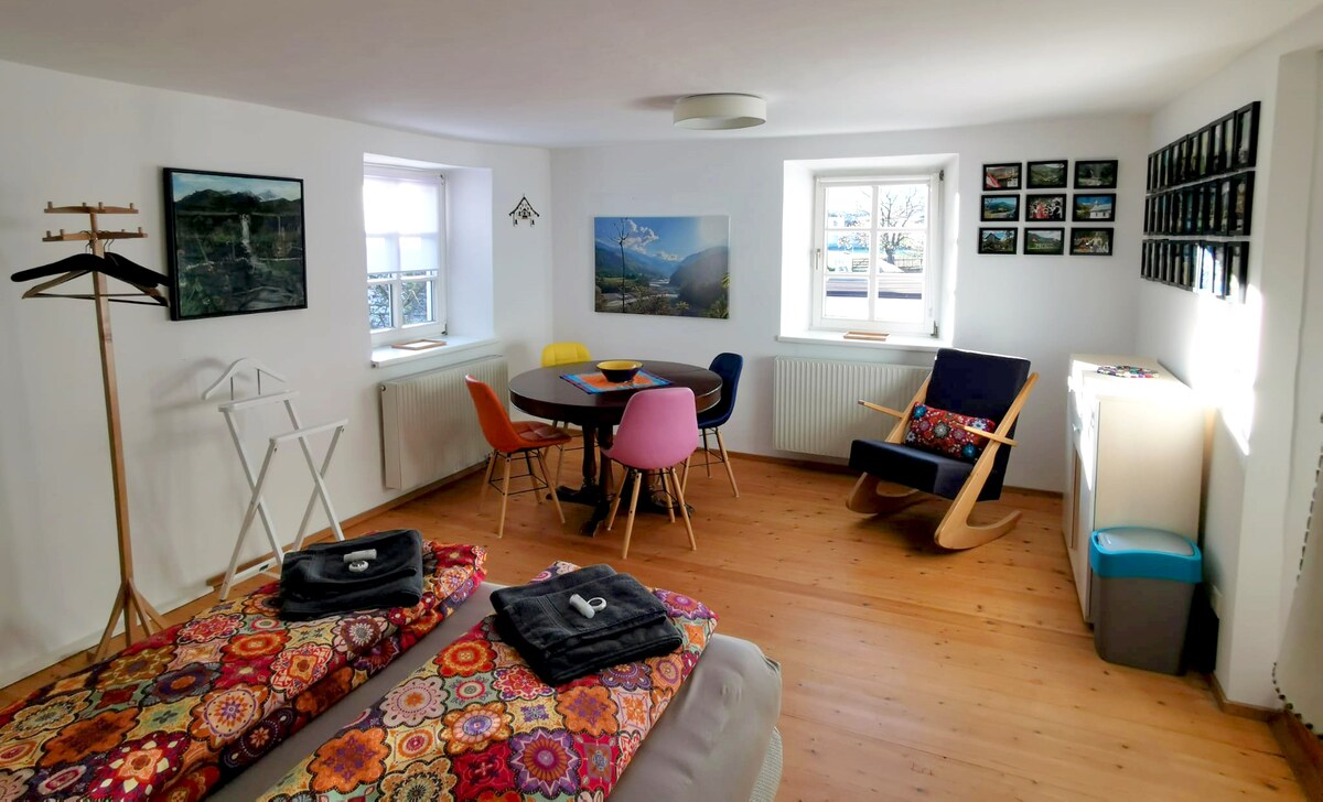 Petit studio dans le grenier de notre maison. Avec coin cuisine, petit balcon et salle de bains avec douche et WC. Idéal pour les clients qui sont de passage, les randonneurs et les skieurs qui voyagent de toute façon toute la journée, qui veulent cuisiner un petit quelque chose dans la soirée et qui veulent terminer la soirée confortablement. Vous pouvez vous préparer un délicieux repas dans la cuisine, mais pas de menu à trois longue, car il ne dispose que de deux plaques de cuisson et il n'y a pas de four, mais il y a un micro-ondes. Si vous voulez beaucoup d'espace, notre chambre est certainement la mauvaise.