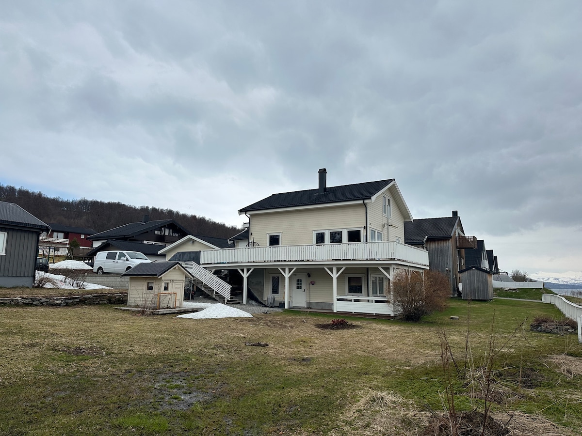 Maison neuve spectaculaire (2018) dans un quartier agréable et calme avec une belle vue sur le fjord/mer, les montagnes et la forêt à Kvaløya /Tromsø. Vous pouvez observer la belle lumière du nord/ aurores boréales depuis l'immense fenêtre (10 m ²), en vous asseyant dans le salon avec une tasse de thé ou de café à la main:-) C'est l'endroit idéal pour les touristes qui veulent voir la lumière du nord, les baleines dans le fjord en hiver, la randonnée/le ski dans les montagnes ou tout ce que vous voulez dans cette belle ville.