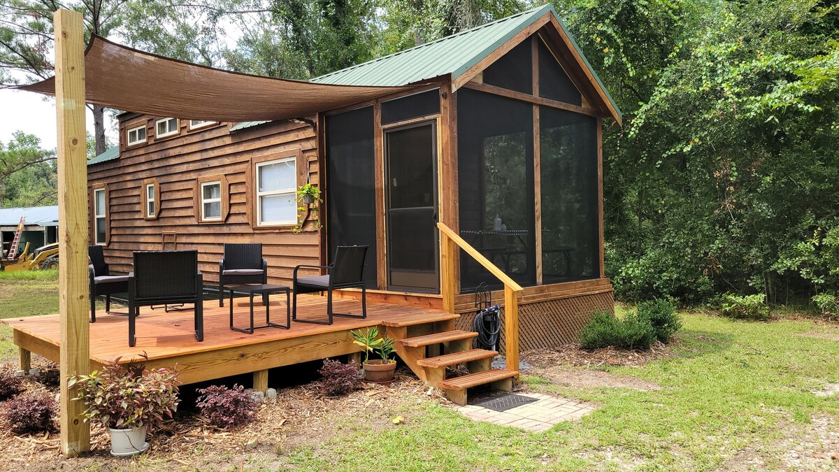 Profitez d'une vie dans une petite maison avec une ambiance de cabane rustique ! Cette maison est située sur une propriété familiale et offre paix, calme et intimité. La grande cour offre beaucoup de places de stationnement et d'espace de rotation. Cette micro-maison dispose d'une cuisine équipée, ainsi que d'une mezzanine avec trois lits simples. Le canapé se retire également pour faire un lit d'appoint. Situé à quelques minutes de Spirit of the Suwannee, des sources locales et des deux autoroutes. Consultez notre autre annonce de tiny house située à quelques pas si vous avez besoin de plus d'espace !