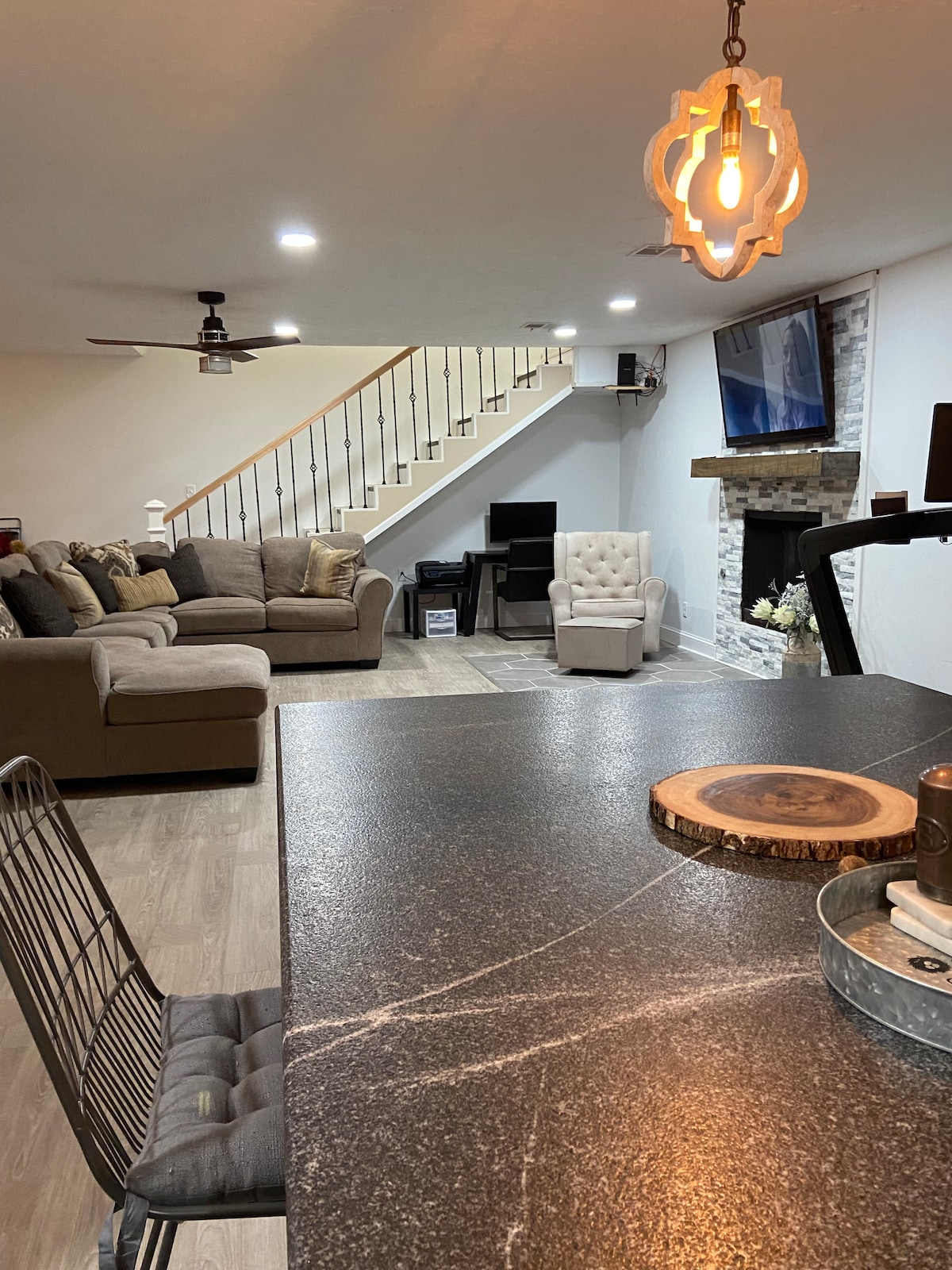 Un côté complet d'une unité duplex, offrant une expérience de service complète. Je m'efforce de fournir non seulement un endroit où séjourner, mais aussi de la qualité et du confort, avec un fauteuil inclinable pour garçon paresseux, une cheminée à bois et un foyer sur le patio avec des lumières d'accentuation permettant de fournir un séjour cinq étoiles à chaque fois. Cuisine entièrement équipée, gril à gaz extérieur pleine grandeur sont disponibles pour les besoins de la cuisine.
