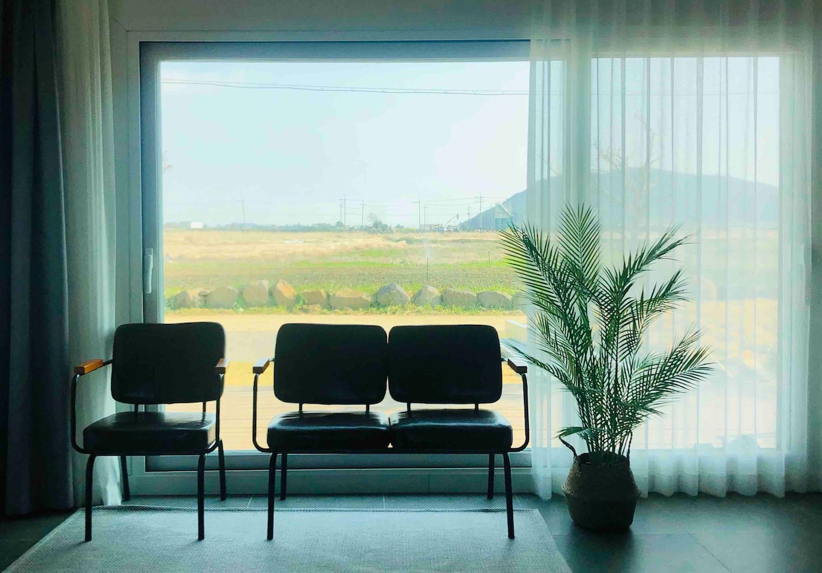 C'est une maison d'hôtes au style élégant située à l'intersection d'un quartier calme menant à la mer de Sagye dans le quartier de Sagye-ri, où il y a beaucoup de choses à voir. Des éléments d'intérieur élégants ont ajouté commodité et confort. Le mont Sanbang et le mur de pierre vus de la chambre principale, ainsi que le champ bleu luxuriant au-delà, offrent une tranquillité incomparable, et la salle de thé chaleureuse se transforme en un théâtre confortable la nuit. Vivez une expérience spéciale dans la cuisine en pierre et les espaces colorés. À partir de 2025, nous avons réduit le prix existant et ne fournissons pas le kit de bienvenue précédemment fourni. Nous vous prions de comprendre. Instagram : sigor_house