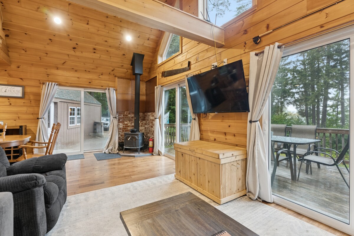 • Perfect for small families or couples, our signature A-Frame cabin features a modern interior gas burning fireplace, soaring ceilings, huge windows, stylish interiors, and all the comforts of home. • This cozy 1,100 square foot space comfortably accommodates up to four guests in two bedrooms (one with a King-size bed and the other with a Queen-size bed) and a shared bathroom. • 7 minute drive to downtown Freeport. • Proud to be ranked in the top 1% and voted Guest Favorite!