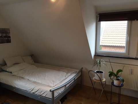 Appartement mansardé très lumineux et calme avec cuisine équipée/lave-vaisselle, salle de bain avec baignoire, douche, WC, bidet, lavabo, niche de couchage dans la maison naine, chambre avec grandes fenêtres de toit et vue fantastique à des kilomètres à l'ouest. Sièges extrêmement confortables, chaîne stéréo, radio et télévision par câble, poêle en plus du chauffage central. Environ 10 min à pied de la gare de l'Est, à environ 15 min de la zone piétonne, à environ 5 min de la zone de loisirs. Abri à vélos verrouillable.