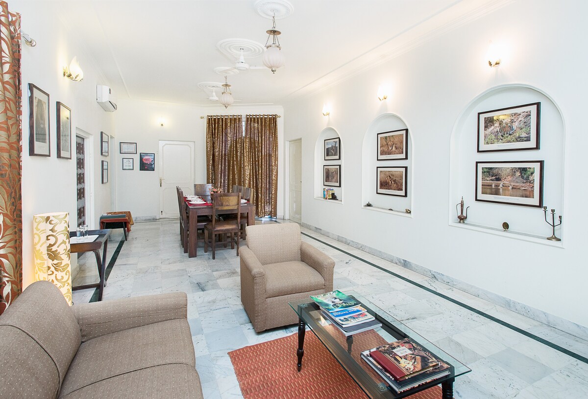 This accommodation is located in Civil Lines, the most premium location in Jaipur. It is a lavish modern bungalow wrapped around with a lush green lawn. The listing has 4 spacious rooms on the second floor to accommodate 14 guests with extra beds. Additionally, it has a luxurious living area, an aesthetic dining area, and a private kitchen. The guests are free to relax and rejuvenate on the beautifully designed terrace. A private cook can be arranged for an additional charge