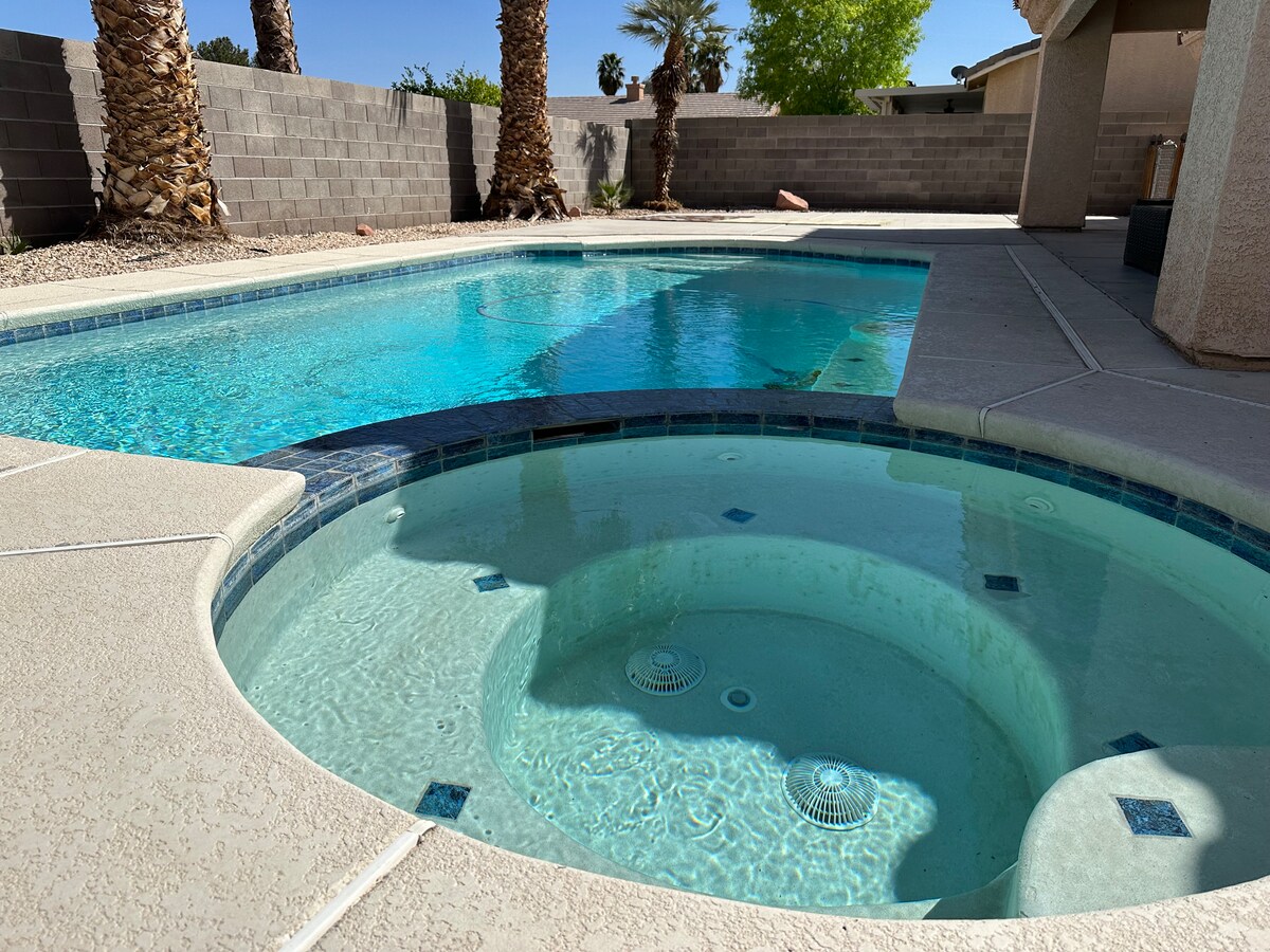 3 chambres (3 lits Queen Size et 1 lit complet), 2 salles de bain complète pour vous détendre et profiter. Belle piscine chauffée et relaxante (chauffage moyennant des frais) et spa, cuisine équipée, salon dispose d'une télévision connectée de 65pouces. Cette maison se trouve juste en bas de la rue depuis Las Vegas Blvd et à quelques minutes en voiture du Strip de Las Vegas, de l'Allegiant Stadium, de T-Mobile, du vieux centre-ville, du parc national de Red Rock et de Hoover Damn. L'espace extérieur comprend des chaises longues confortables, une table extérieure et un coin salon dans le patio couvert. Voir les détails pour en savoir plus.