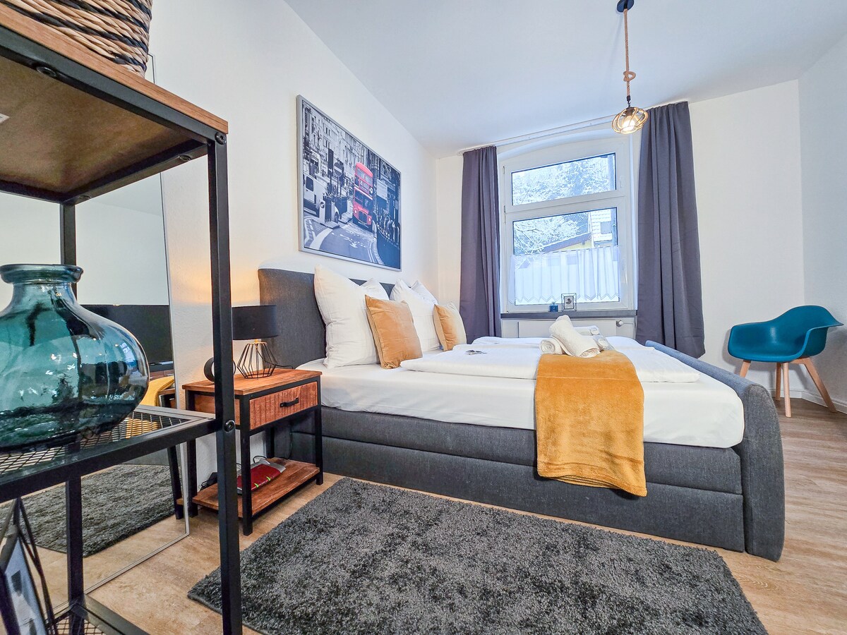 Nous proposons dans notre grenier deux appartements entièrement meublés, de haute qualité et identiques. Ceux-ci disposent d'une chambre avec un lit simple, d'une cuisine-salle de séjour ainsi que d'une salle de douche avec WC. L'université de la Ruhr, l'institut allemand des avocats (Vita Campus), le BioMedizinPark (IFK, Aesculap Akademie) sont accessibles à pied en 10 à 15 minutes.
