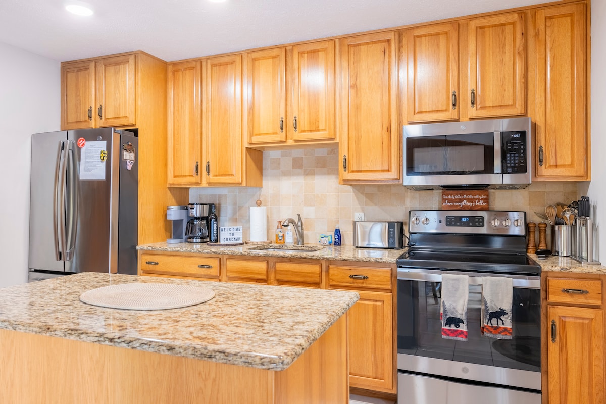 Bienvenue amis! Grande maison pour la saison de baseball. Chaque chambre est grande, accueillante et offre un magnifique éclairage naturel avec ses 56 fenêtres. La maison est équipée d'une grande cuisine et de deux salles à manger privées pouvant accueillir 14 personnes. Le salon principal possède une section en duvet de plumes personnalisée accompagnée d'un beau salon avec chaise longue et de deux chaises longues. Traversez le foyer et montez l'escalier immaculé pour trouver quatre grandes chambres à coucher et deux salle de bain complète.