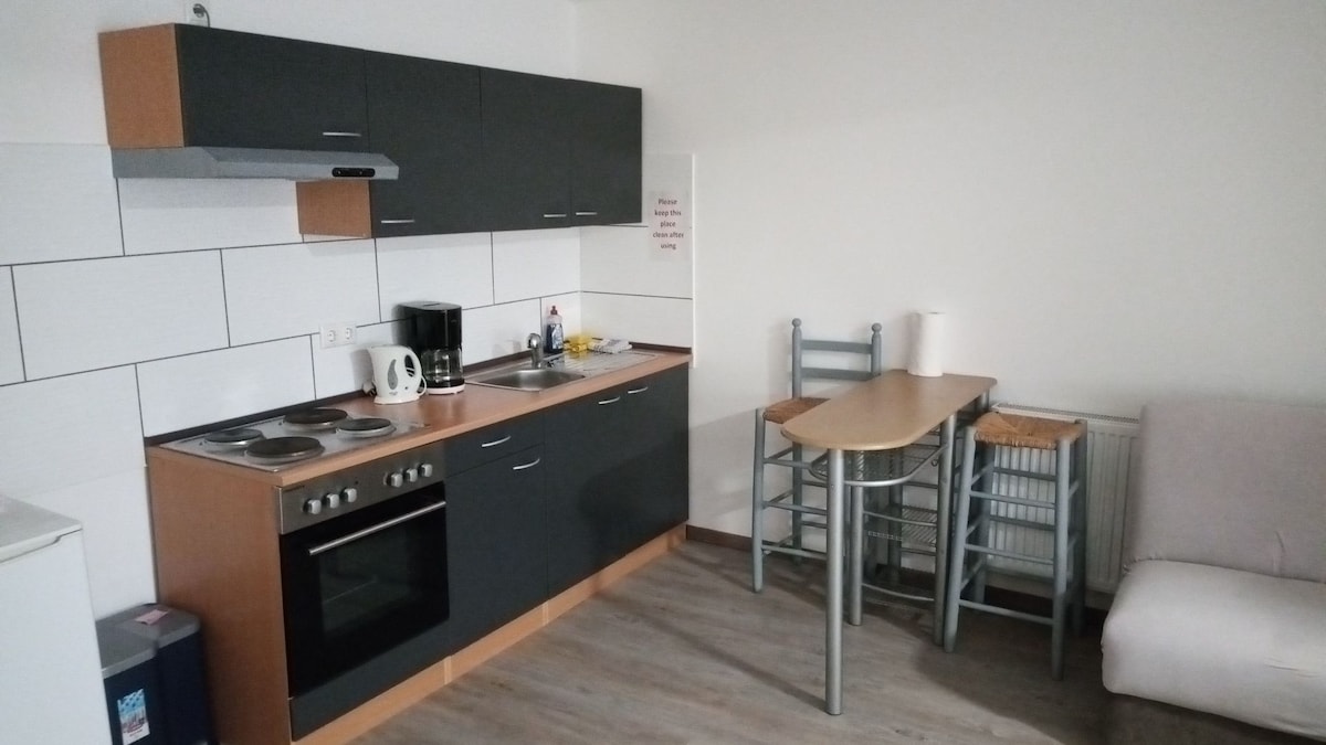 Salon-chambre à coucher de 24 m², Cuisine de 16 m², Salle de bain, couloir ; au total 50 m², entrée séparée, Le propriétaire habite dans la maison arrière sur le même terrain, Télévision par satellite, cuisine entièrement équipée (par exemple, bouilloire, micro-ondes, grille-pain, cuiseur à œufs, machine à café (Tassimo), réfrigérateur avec congélateur, cuisinière électrique, casseroles, vaisselle, etc.) Fumer dans la cour. On y trouve un coin salon avec une petite table et un cendrier.