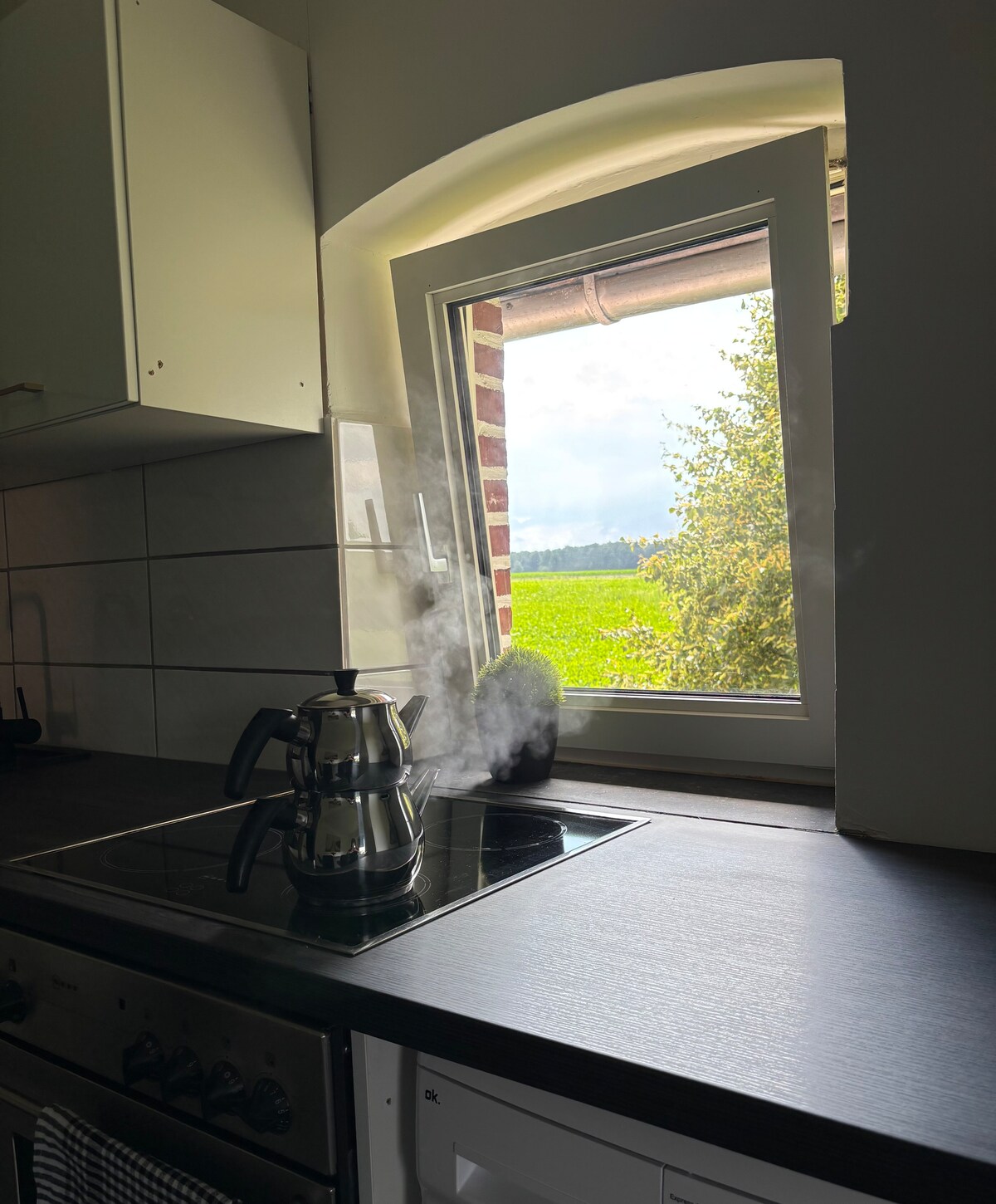 Modernes Studio mit Terrasse und Blick in den Obstgarten – ideal für entspannte Tage im Grünen. Genieße deinen Kaffee aus der Siebträger-Kaffeemaschine oder entspanne bei Netflix und Amazon Prime. Einkaufsmöglichkeiten sind besonders bequem: EDEKA, ALDI und eine Bäckerei liegen direkt gegenüber. Der Bahnhof ist in etwa 15 Minuten zu Fuß erreichbar, die A30 in nur 2 Minuten. Für Elektroautos besteht zudem eine Lademöglichkeit vor Ort. Perfekt für 1–3 Gäste.