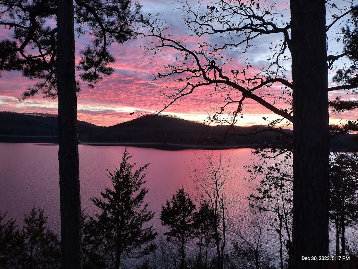 Venez profiter de ce chalet au bord du lac qui dispose de 3 chambres, 2 salles de bain, 2 salons spacieux avec téléviseurs intelligents dans chacun et un service de vaisselle. Cheminée à bois au 1er étage, bibliothèque et jeux de société au 2e. Détendez-vous et profitez d'une boisson chaude ou froide sur un patio sur le toit avec vue panoramique sur le lac Table Rock et la beauté des Ozarks. N'oubliez pas de laisser vos soucis s'évaporer dans le jacuzzi en bas et de vous amuser dans la salle de jeux du garage pour 2 voitures ou de faire une courte randonnée privée jusqu'au lac. Chalet familial et adapté aux animaux de compagnie !