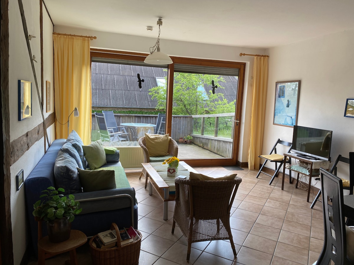 L'appartement ensoleillé et lumineux « Scheunendiele » est situé dans une grange à colombages aménagée avec son propre jardin et une terrasse ensoleillée. Spacieux 60 m², salon avec cuisine ouverte entièrement équipée, offrent de la place pour 2 à 4 personnes. La salle à manger équipée pour jusqu'à 4 personnes se trouve à côté du salon avec canapé et fauteuils et un coin lecture supplémentaire près de la cheminée. Les deux chambres se trouvent à l'étage supérieur, avec vue sur le magnifique jardin.