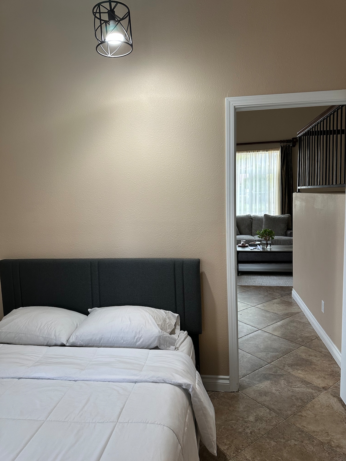 Une chambre spacieuse dans une maison nouvellement construite à Menifee, près de Paloma High School et de l'autoroute 215. La chambre dispose de sa propre entrée privée avec un clavier ainsi que d'une salle de bain complète attenante, d'une télévision connectée, d'une cafetière, d'un placard, d'un petit réfrigérateur et plus encore. Pas d'accès à la maison principale, la porte du reste de la maison sera verrouillée pour l'intimité de toutes les parties. La climatisation est centrale dans tout le logement et n'est pas accessible dans la zone des voyageurs. Vous pouvez demander des ajustements de température par message