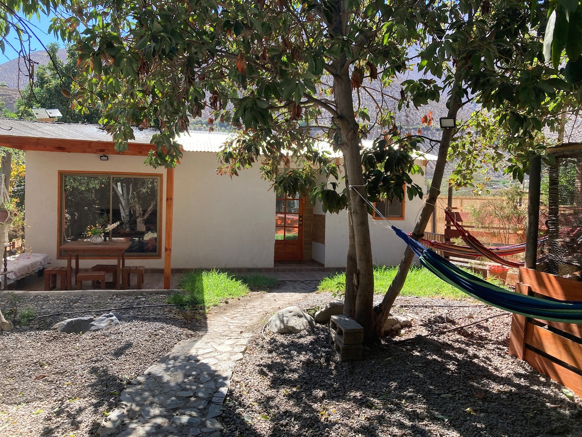 Belle cabane indépendante avec vue sur les montagnes et accès à la rivière. À 4 minutes en voiture du centre de Pisco Elqui ou à 20 minutes à pied. Idéal pour ceux qui veulent être proches du centre, mais loin du bruit. En été, le potager et les arbres fruitiers du jardin sont à votre disposition pour que vous puissiez cueillir des fruits et des légumes. La nuit, vous serez entouré par l'immensité du ciel et de ses étoiles. Le chalet dispose d'une chambre avec un lit double et un fauteuil convertible pour 2, idéal pour les enfants.