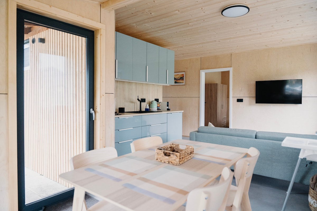Studio shelter house d'une superficie de 33 m² avec balcon dans une lucarne, avec une belle vue sur les Tatras occidentaux. Intérieur spacieux de 4 mètres avec finition en bois de mélèze. Lit « king size » 180 x 200 cm avec possibilité de séparation en 2 lits simples. Kitchenette avec lave-vaisselle, réfrigérateur, micro-ondes, grille-pain et cafetière. Le canapé-lit de 100 cm de large rend le studio confortable pour 2 personnes ou 2 personnes avec un enfant. Baignoire dans un espace ouvert, toilettes avec lavabo dans une pièce séparée.