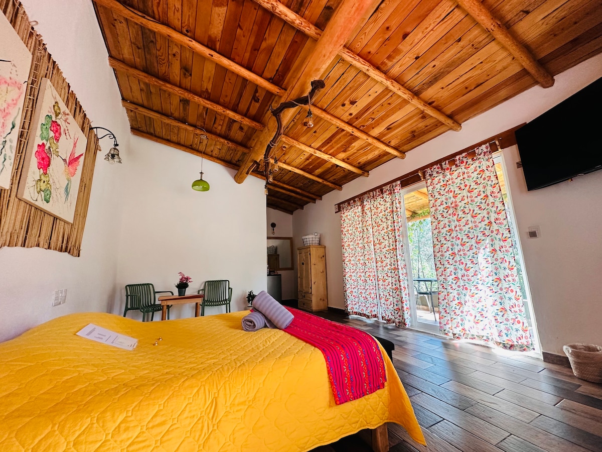 Cabane confortable, lit Queen Size, poêle à bois de style mennonite, grand jardin et terrasse pour se reposer le week-end sans en sortir ; excellente vue naturelle, à 5 minutes de Huasca, à 15 minutes des prismes basaltiques et des haciendas de Santa María Regla et San Miguel Regla, à 20 minutes de Peña del Aire. Renseignez-vous sur nos expériences (dîner romantique, jacuzzi d'amour, soirée cinéma, vélo, VTT, course à pied) que nous pouvons organiser à votre goût. Nous parlons anglais.