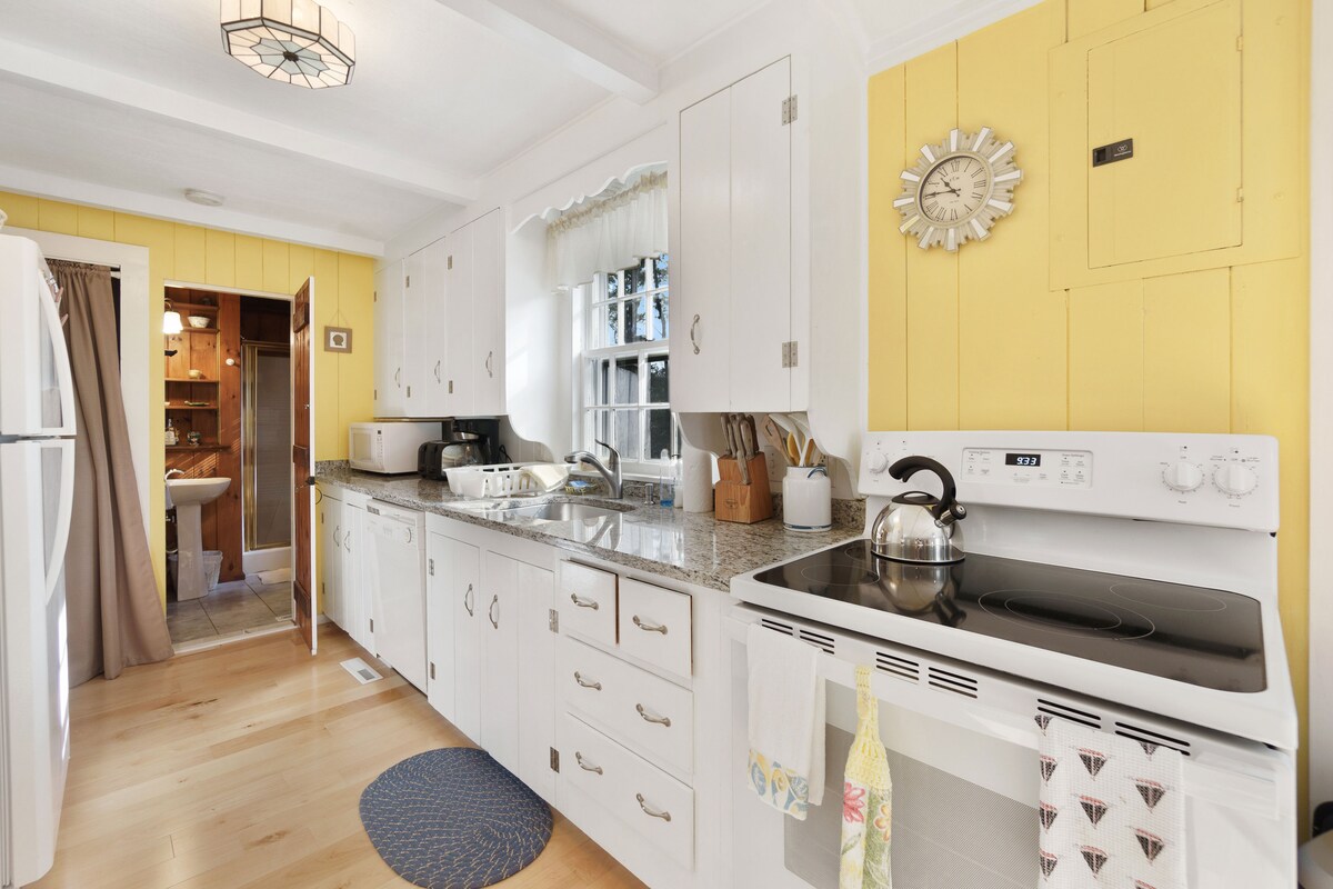 Nos logements sans maison comprennent ce charmant studio avec pelouse, une terrasse privée avec mobilier d'extérieur et un barbecue à gaz. Le chalet est confortablement meublé et dispose d'une petite cuisine. Ce chalet dispose d'un lit queen size et d'une table avec coin salon. La cuisine est joliment rénovée avec de beaux plans de travail en granit et des appareils en acier inoxydable, y compris une cuisinière/four, un micro-ondes, un mini-réfrigérateur, un grille-pain, une cafetière Keurig et une bouilloire.