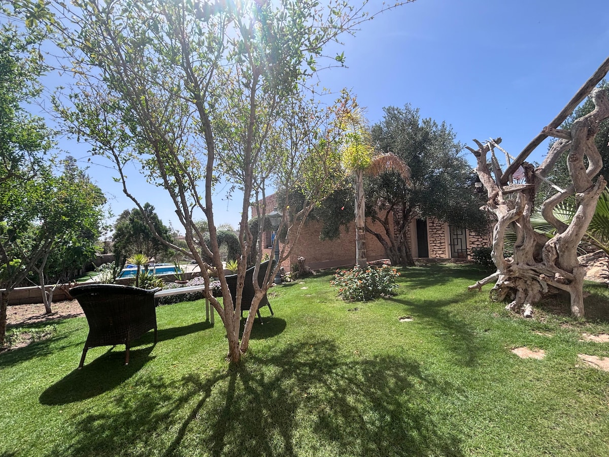 Villa climatisée avec piscine sur un terrain arboré et fleuri sans vis-à-vis à seulement 17 minutes de la ville d’Essaouira et de la plage. Notre villa est à seulement 16 kilomètres d’Essaouira, à la campagne où il y a plus de soleil et moins de vent qu’à Essaouira qui est au bord de l’océan. La villa vous offre le confort et l’intimité dont vous avez besoin pendant vos vacances avec zéro vis-à-vis: la villa est entourée de champs. La villa, le jardin et la piscine sont entièrement pour vous.