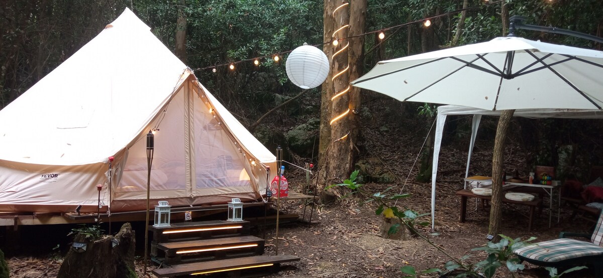 Tente Bell confortable, conçue pour ceux qui apprécient la tranquillité et les petits détails. Parfaite pour 2 ou 3 personnes, avec un lit double, un lit simple et suffisamment d'espace pour se reposer confortablement. Vous ferez partie d'un espace écologique entouré d'arbres, où la déconnexion est garantie. À l'extérieur, vous pourrez profiter d'un espace intime et privé, où vous pourrez vous reposer, pique-niquer ou simplement vous détendre. Des salles de bain partagées et une atmosphère conçue pour profiter sans hâte.