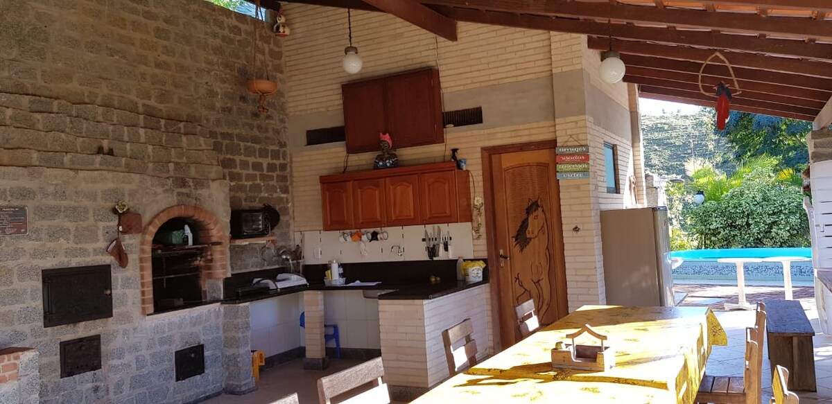 Casa com 4 quartos sendo 1 suíte + 1 banheiro social, sala c sofá cama TV a cabo, WIFI, cozinha ampla c mesa de madeira c 6 cadeiras , áreas externa c + 2 mesas de madeira . piscina + 2 banheiros externo , churrasqueira, fogão a lenha c forno + 1 fogão de 2 bocas industrial. Uma ampla área Kids com escorregador, gangorra e balanço. 2 lagos c Jardim de inverno e lareira externa , raia de bocha e sinuca . uma pequena cachoeira c água corrente e mini Pomar.