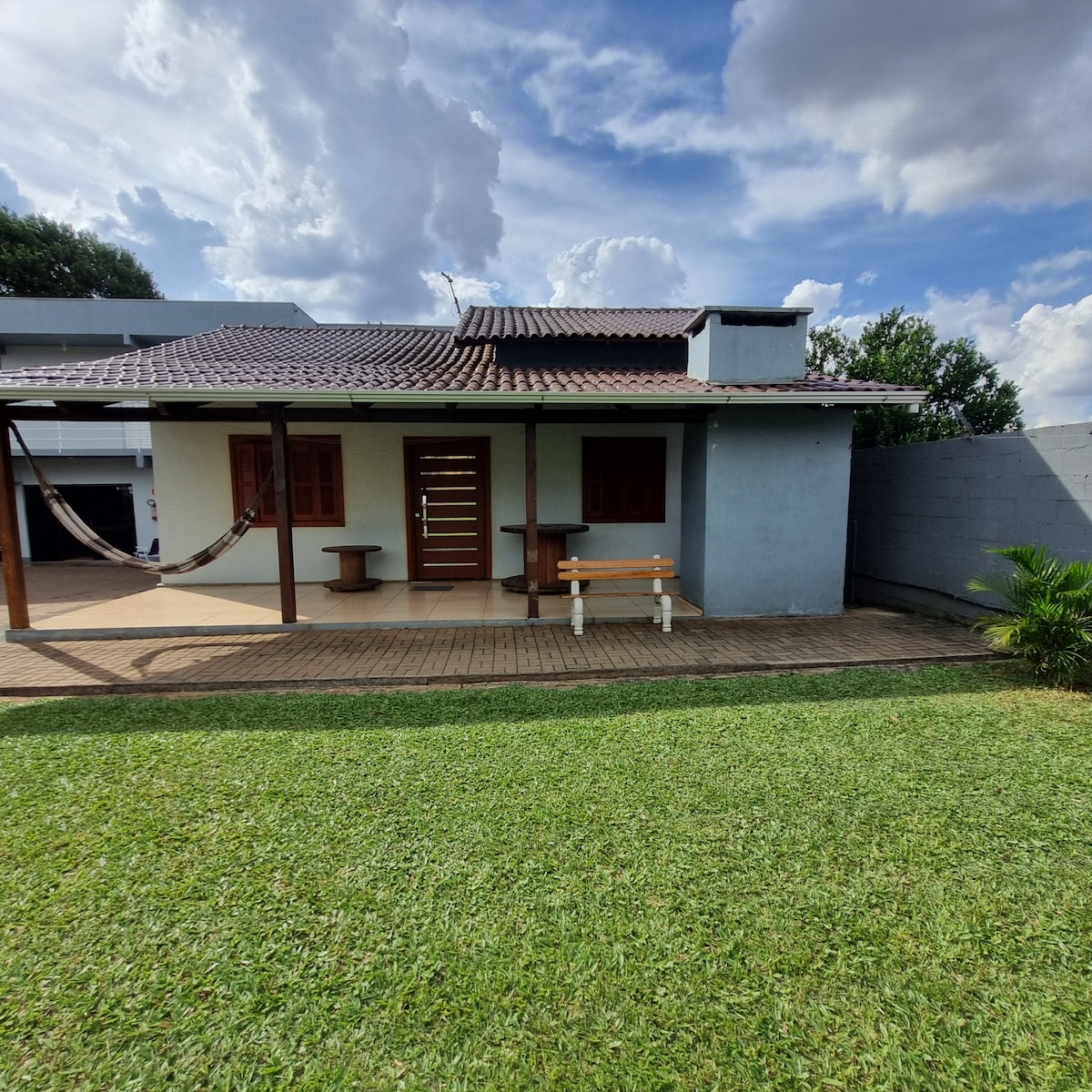 Somente andar térreo, um casal de jovens senhores moram no 2°andar. Cozinha com utensílios, forno e microondas. Sala de jantar. sala de estar. TV 43″. 2 quartos com 2 camas de casal e solteiro. Banheiro. Garagem fechada e coberta. Fornecemos roupa de cama e banho. Ar condicionado em um quarto. Ótima localização. Seguro. Distância de 900 metros (2 min. de carro) da Havan e Atacadão Stok Center. A 5 min. de carro do centro. Restaurante/churrascaria e farmácia tudo a menos de 450m.