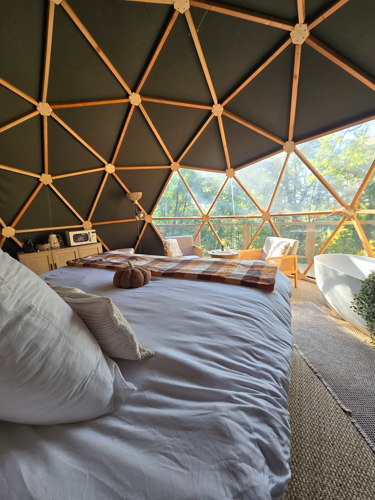 Évadez-vous dans notre dôme bohème en pleine nature. Un cocon chaleureux pour une pause hors du temps. Profitez d’un grand lit king size, d’un coin détente et d’un jacuzzi privatif sur la terrasse pour une expérience unique au cœur de la forêt. En option un petit-déjeuner à 15€/personne livré sur la terrasse et bouteille de champagne à 45€ pour sublimer votre séjour.