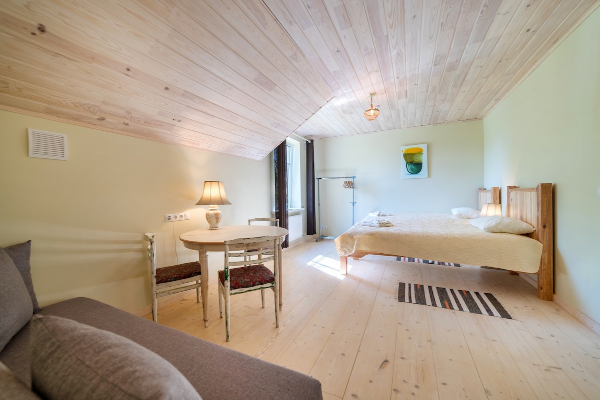 Situé au milieu de la belle région de Latgale, cet endroit vous permettra de voyager pendant la journée et d'explorer efficacement des localités inoubliables. Les environs de la maison sont surréalistes avec le 3e lac le plus profond de Lettonie qui brille à travers la fenêtre de votre porte et une friandise maison traditionnelle, fraîche et délicieuse qui vous attend à votre arrivée, gratuitement ! Pour chaque voyageur suivant, vous devez payer le même prix que pour le premier !