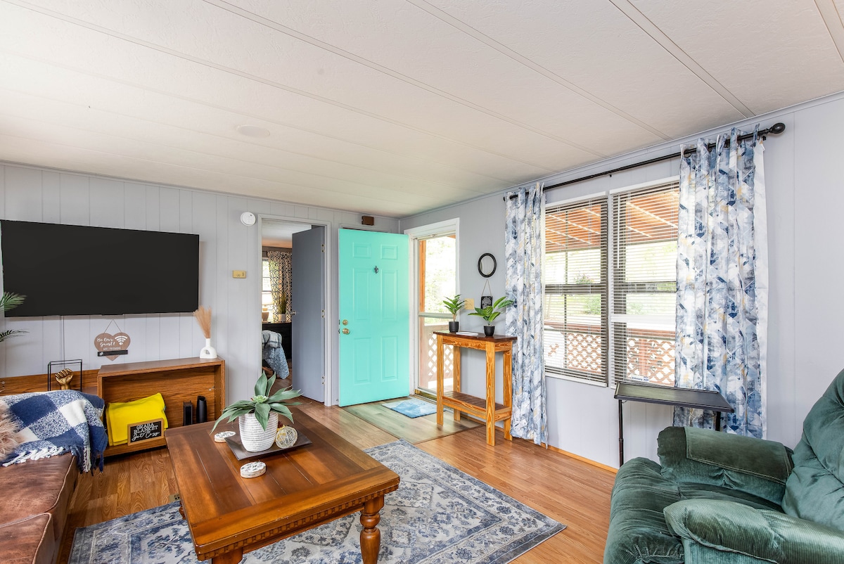 Relax with the whole family at this peaceful setting. Close to interstate 77 and 40, this rural farm is rustic elegance. With a library for the family and a vintage-inspired home theater with classic DVD's, you have plenty to do even on rainy days. The bedroom has a king bed, and the main room includes a trundle with two twins and a futon sofa. This 900 sq. ft. guesthouse was the old welding shop from years ago and gives you access to walking trails and the farm burn pit.