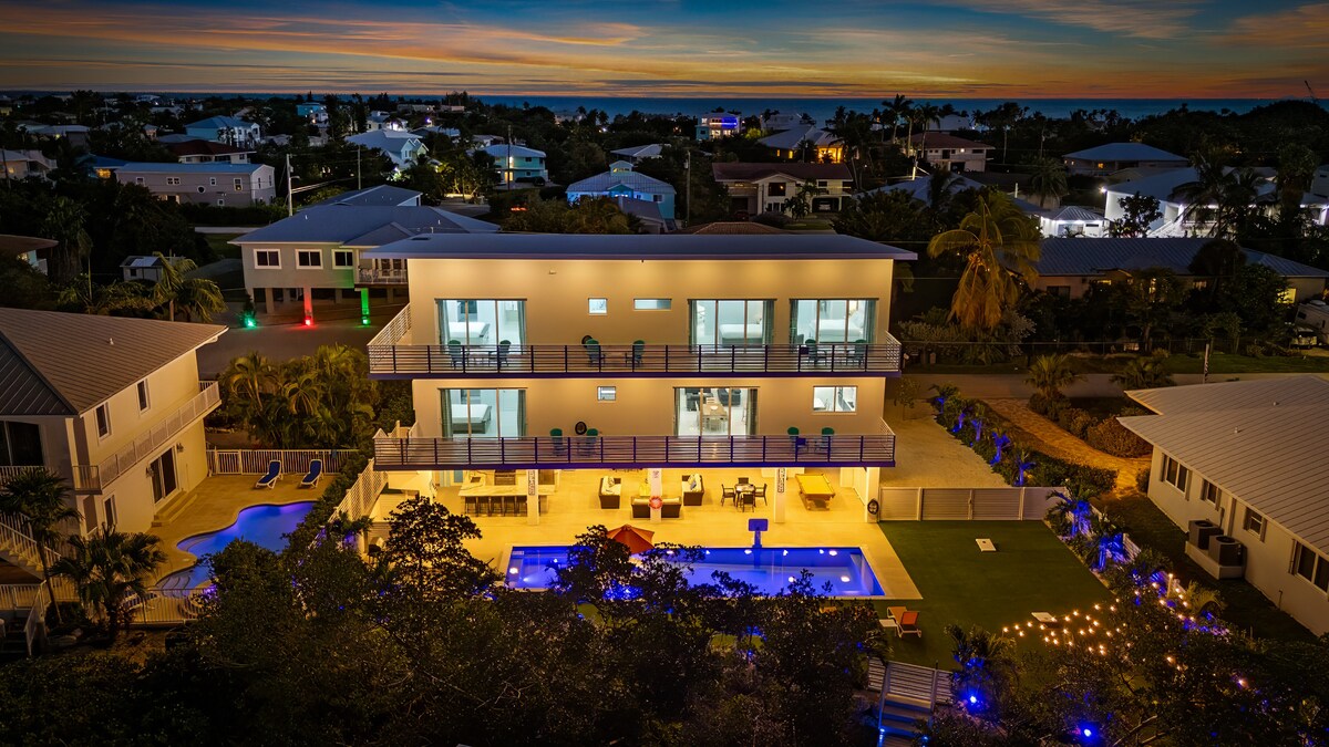 Entire Waterfront Home. 5 Bedroom, 4 Full Baths, Heated Pool with attached Soaking Tub, Tiki Hut with bar and seating, Ample Parking, Big Fenced Yard, First and Second Floor Covered Balconies, 110' waterfront with 80' Dock, 5 Minute Walk to Beach, 10 Minutes to ValHala Sand Bar, on a 200' Wide Canal. Licensed to sleep up to 12 guests; 5 King Beds, 1 Pullout Sofa Bed. Outdoor 4 lounge chairs, 12 adirondack chairs. Fully stocked kitchen. Beautiful location. License No. VACA-22-157