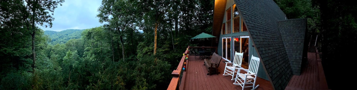 TOUTE NOUVELLE RÉNOVATION ! Assis sur 11 acres de terrain de montagne et à seulement 20 min du centre-ville d'AVL - Notre suite confortable de cabane est parfaite pour les familles et les couples pour découvrir le meilleur de l'ouest de la Caroline du Nord. Nous offrons une cuisine complète, une salle de bain spa, trois nouvelles chambres magnifiquement sélectionnées, un grand salon et un coin repas confortables, une grande terrasse et un décor unique plein de vie et de caractère. Détendez-vous ou partez explorer !