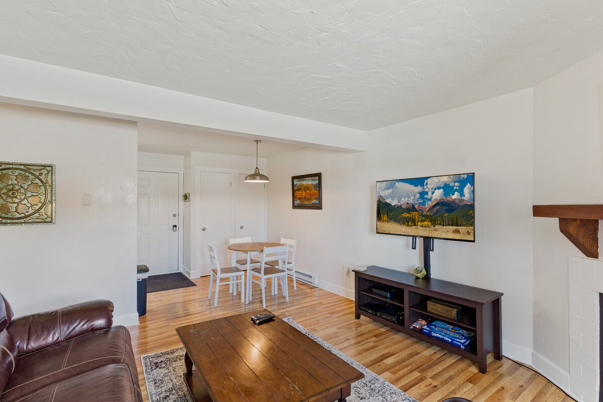 Come stay awhile at this cozy 2 bedroom, 1 bath condo just 1/3 of a mile to the mountain base! Located just steps from the free shuttle that takes you to the gondola or downtown. - 10-15 walk to gondola or take free bus - 5-10 drive to downtown - Free on-site parking for 2 vehicles (no trailers allowed) - Fully equipped kitchen - Private patio with gas grill - Gas fireplace - 65” Smart TV - Memory foam beds What's ours is yours! Make yourselves at home! *Per HOA rules, pet's are not allowed*