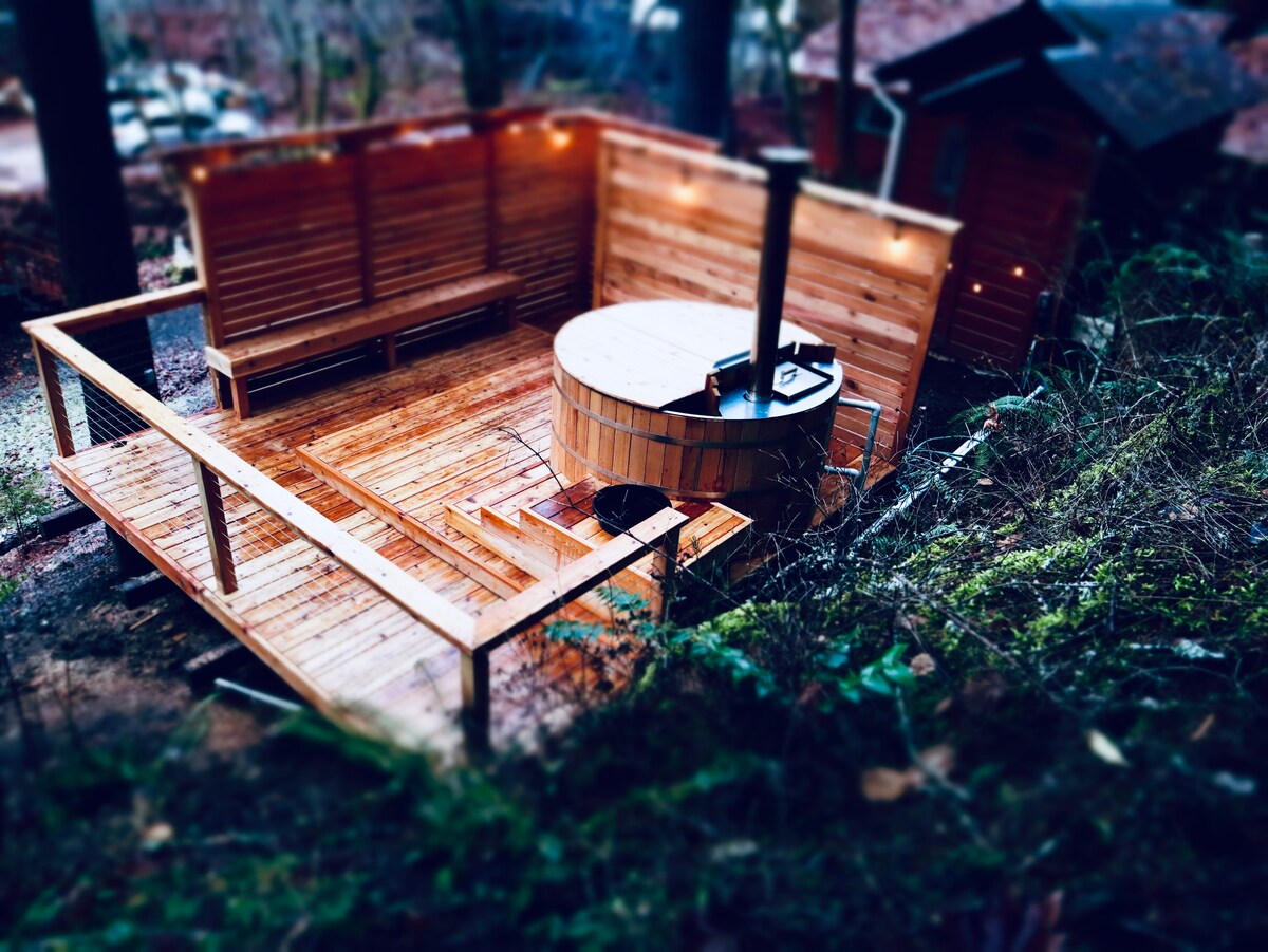 Bienvenue dans notre cabane confortable, nichée dans la forêt luxuriante de l'Oregon à côté d'un ruisseau saisonnier. Alliant le charme rustique de l'artisan à une touche bohème, notre cabane offre une ambiance chaleureuse avec une kitchenette bien équipée, un salon et un coin repas avec bar en noyer. Dans le loft de la mezzanine, vous trouverez un lit Queen Size bio et un espace de travail avec un futon dépliant. Profitez de notre jacuzzi au feu de bois, des sentiers de Wagner Creek, des vignobles à proximité et du festival Shakespeare, offrant un mélange de beauté naturelle et de culture locale.