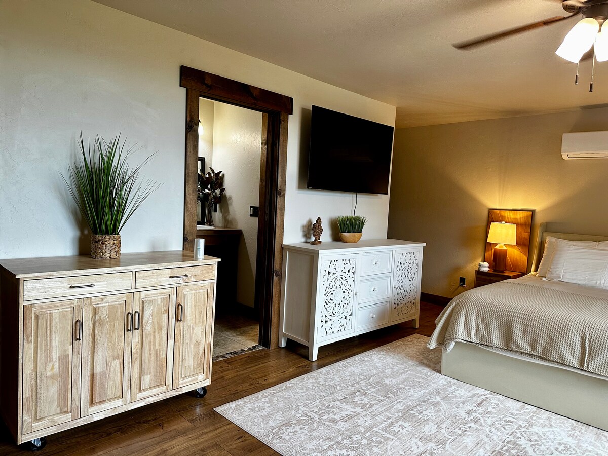 Tout nouvel appartement au sous-sol en bas de la rue Main St. à Ashland. Cet espace moderne est propre et paisible. Chaque chambre est équipée de matelas haut de gamme, de draps, d'une télévision et de peignoirs. Vous y trouverez de nombreux livres à lire et des jeux de société pour vous divertir. Profitez d'une courte promenade jusqu'au centre-ville où vous trouverez le parc Lithia, des restaurants, des cafés et des magasins ! À 25 min en voiture du mont Ashland et du VTT de classe mondiale. À distance de marche du festival Shakespeare. Beaucoup de beaux vignobles à proximité !