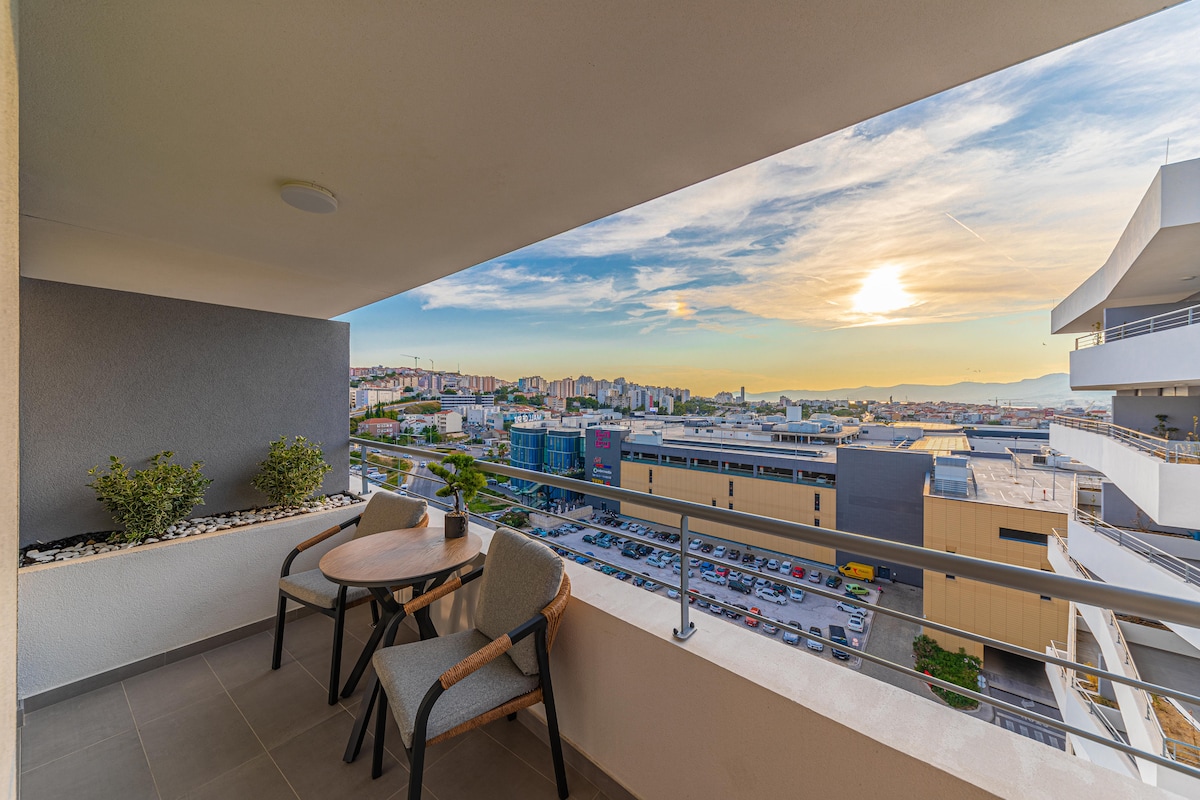 Nous vous invitons à profiter de cet espace unique avec une vue imprenable sur la ville de Split, la mer et les îles. L'appartement est confortable et élégant , situé à Solin, à 15 minutes en voiture de l'aéroport, à 10 minutes en voiture de la vieille ville de Split et de ses monuments, restaurants, bars, plages, promenade en mer. Si vous arrivez en voiture, stationnez-la devant la maison. La gare routière en face de Split et Trogir est à deux pas, les épiceries sont à 5 minutes à pied de l'appartement. Vous pouvez facilement rejoindre la route vers l'autoroute .