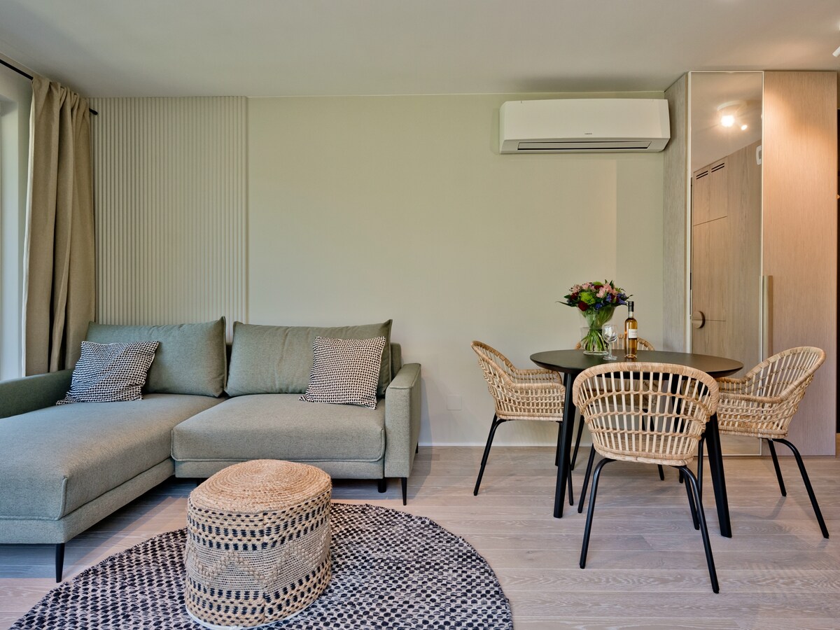 L'appartement se situe au deuxième étage, donnant sur la verdure et le phare. La plage est à 150m. Le bâtiment est entouré d'un beau jardin bien entretenu où vous pourrez vous détendre sur un hamac en été, en écoutant le bruissement de l'herbe et le bruit de la mer. Bien que les enfants puissent profiter de l'aire de jeux, les parents pourront se détendre au barbecue extérieur.