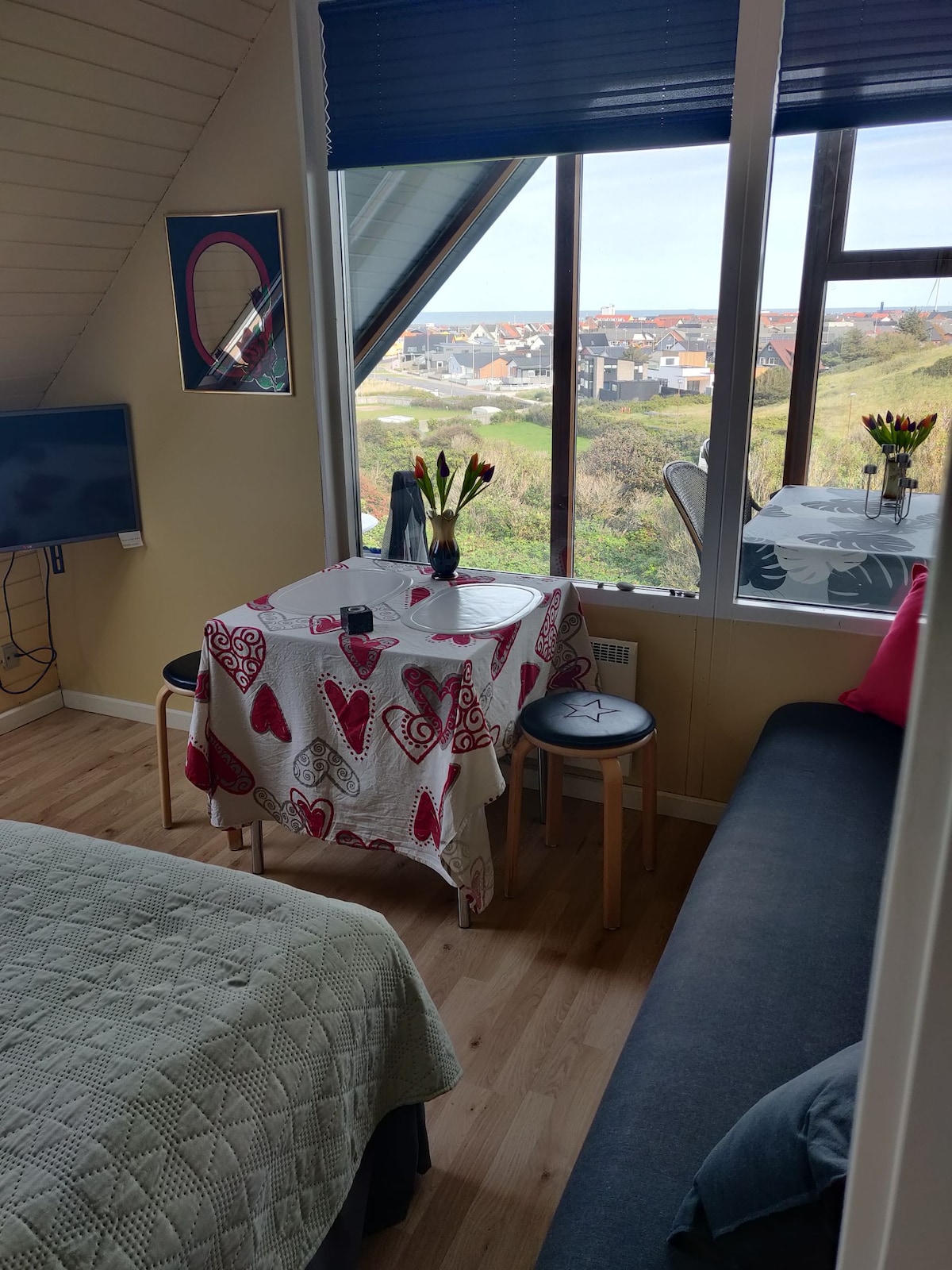 Cette chambre avec vue sur la mer vraiment unique avec les plus beaux paramètres à 30 mètres de la mer directement vers Kattegat. Accès à la plage à moins de 100 mètres et terrasse extérieure avec douche extérieure Nordic Seashell. Une escapade idéale pour un couple pour profiter d'une vue tranquille sur la mer et d'une faune fascinante avec des phoques, des cygnes et une myriade d'espèces d'oiseaux différentes. Orientée à l'est pour un magnifique paysage de lever de soleil. Profitez du soleil se couchant sur l'océan depuis votre patio couvert par un auvent électrique. Porte à gauche du mur.