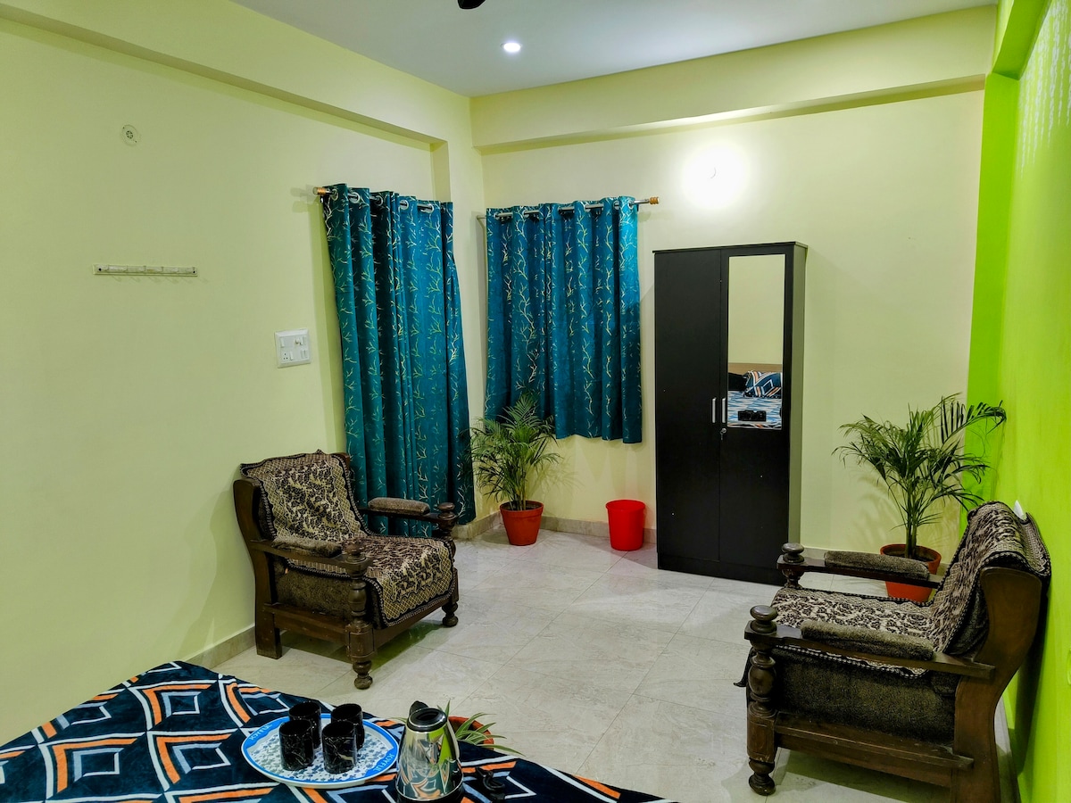 2 BHK avec balcon avec plantes intérieures vertes d'origine. À 1 km à pied de Kumbh Mela et à proximité immédiate de tous les lieux saints de Prayagraj. Cuisine maison disponible à un prix raisonnable.