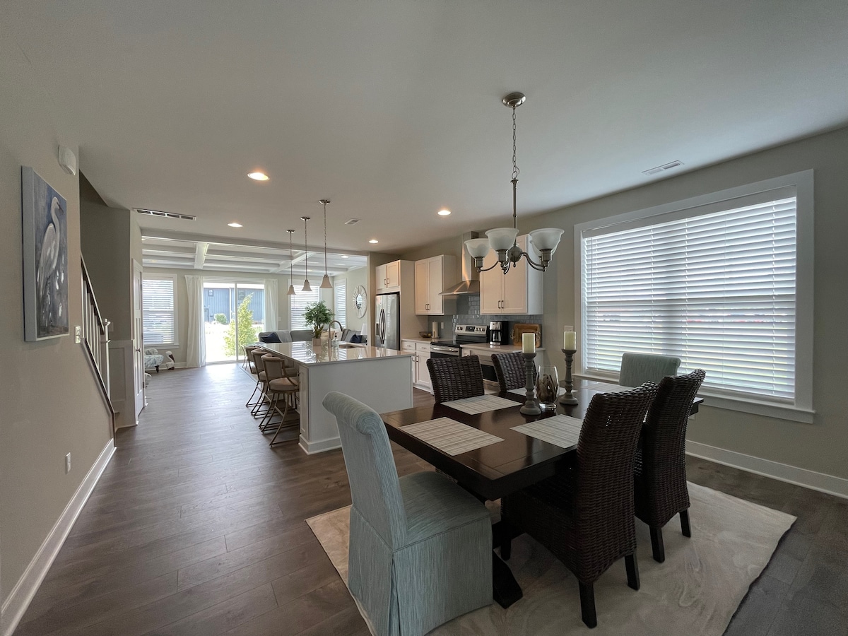 Cette maison est parfaite pour tout le monde, située au centre d'une belle ville balnéaire avec des magasins locaux, des magasins d'usine, des restaurants familiaux, des activités et un accès à plusieurs plages, le tout dans un rayon de 10 miles. Profitez d'une vie nocturne animée ou détendez-vous à la maison avec des jeux de société, du ping-pong, du cornhole et un foyer à gaz extérieur. Le balcon du troisième étage peut accueillir 10 personnes et offre une vue sur les étoiles et le coucher du soleil. Profitez de notre piscine communautaire chauffée ou faites un tour à vélo sur la piste cyclable de 17 miles située à quelques pas de notre porte.