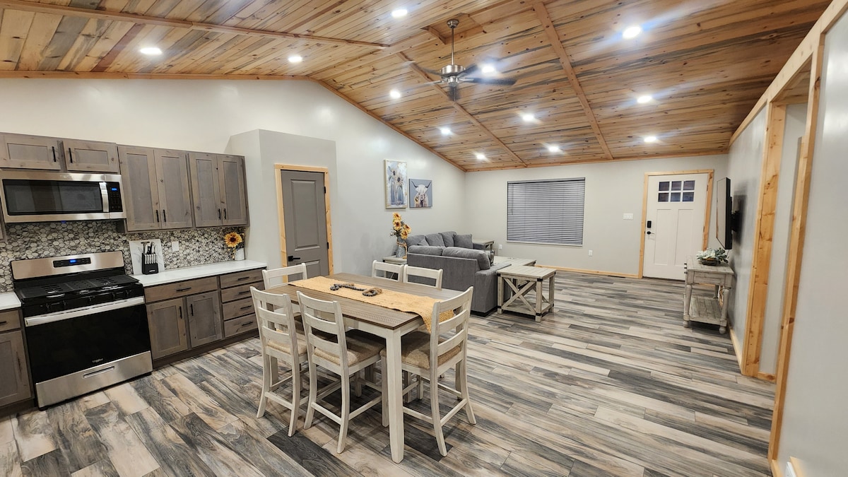 Profitez de votre propre plage privée donnant sur le réservoir de Gunnison Bend. Beaucoup de pelouse et de sable pour jouer. Les arbres matures offrent une ombre abondante et une beauté au paysage. Une balançoire dans les arbres au bord de l'eau. Cuisine entièrement approvisionnée, lave-linge et sèche-linge inclus pour les séjours prolongés. Profitez du petit-déjeuner, du déjeuner et du dîner sur le patio à quelques pas du bord de l'eau. Vous apprécierez le canotage, le kayak, le paddle, le skimboard, la pêche et la construction de châteaux de sable juste devant votre porte arrière.