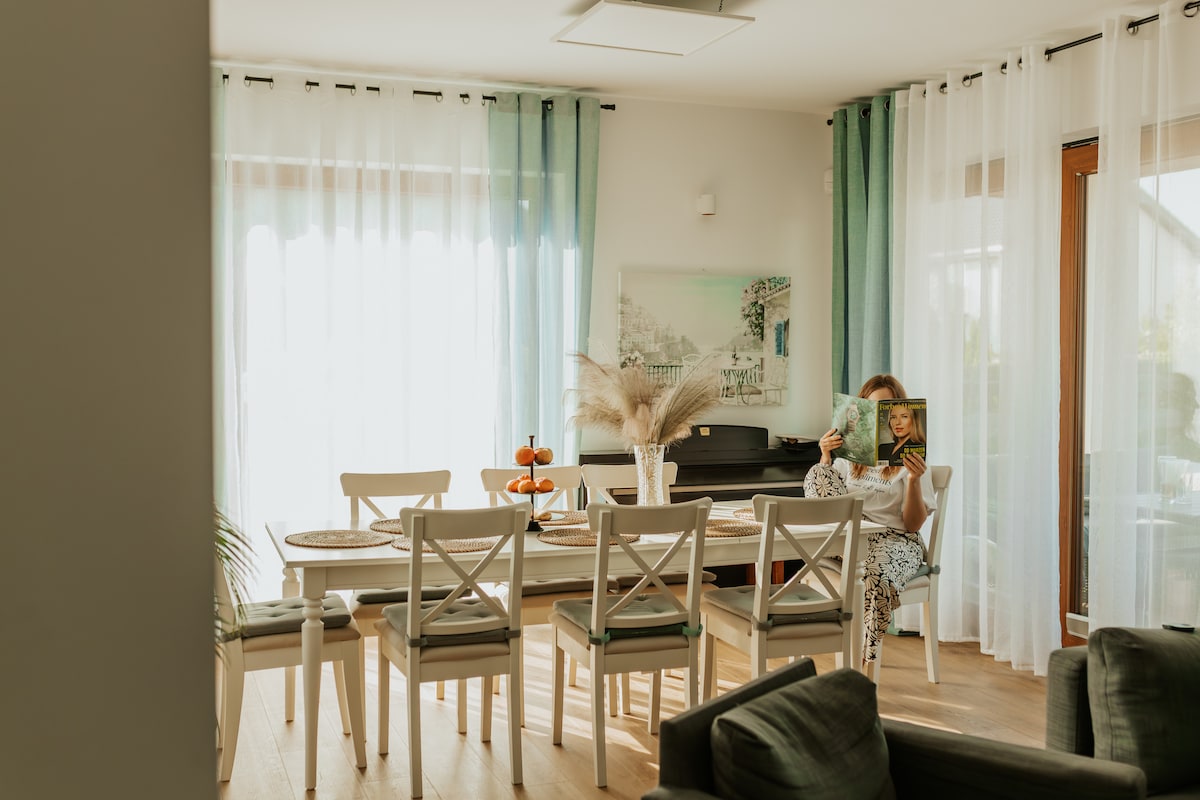 La maison Bielawy a été spécialement conçue pour la détente. Elle dispose d'une piscine chauffée moderne sans chlore (oxygène actif) avec un banc de massage, un jacuzzi pour 6 personnes et un sauna de haute qualité. Le jardin spacieux comprend une aire de jeux, une table de ping-pong, des barres de singe, un trampoline et un terrain de volleyball ! À l'intérieur de la maison, vous pourrez vous détendre près de la cheminée, jouer au baby-foot, à la Xbox ou au poker. La cuisine bien équipée offre des conditions idéales pour cuisiner. À proximité, il y a de beaux lacs et forêts.