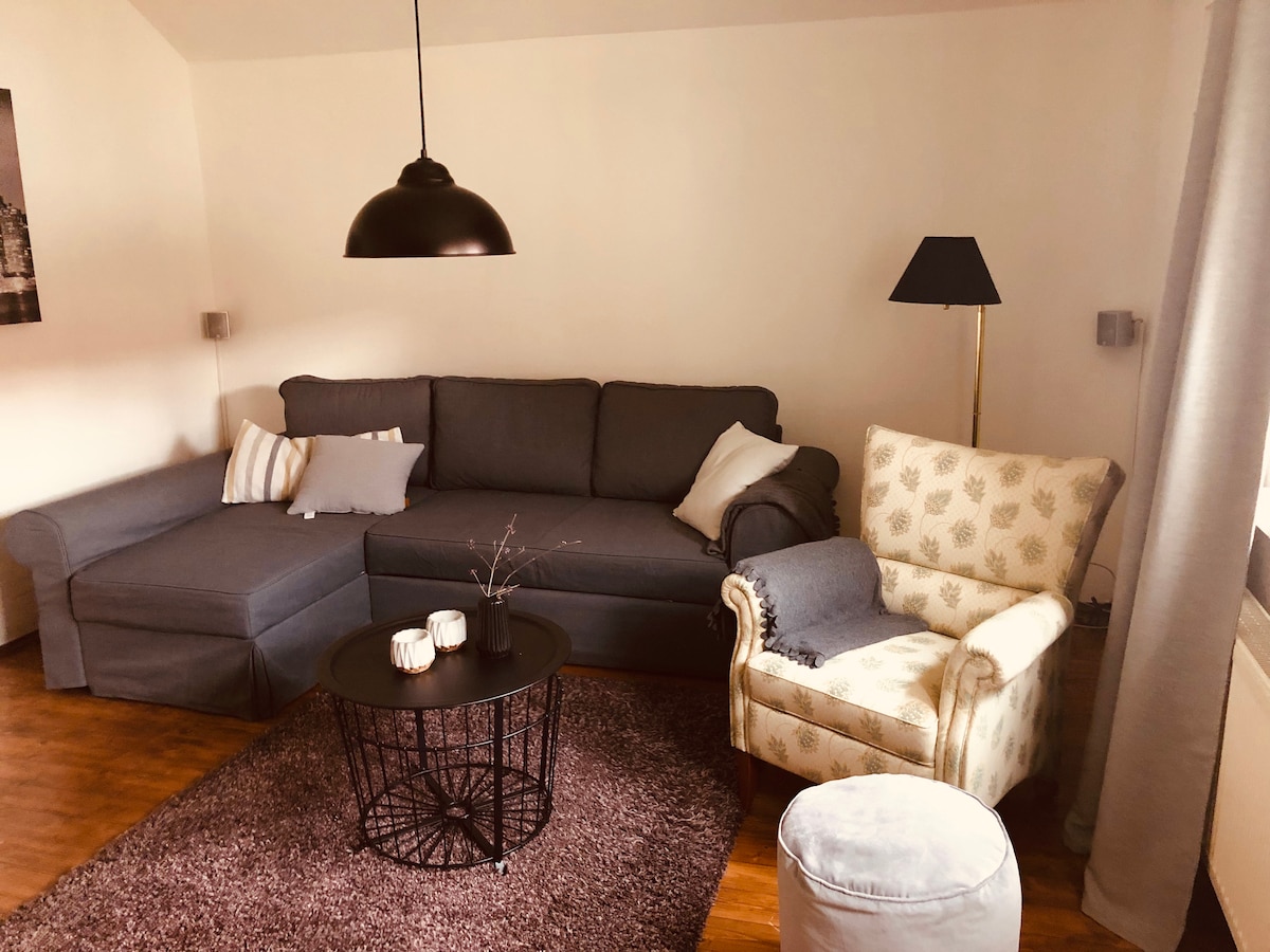Tu emménages dans un appartement indépendant avec salle de bains et kitchenette dans ma maison dans un endroit calme sur le mur extérieur de la ville. Une machine à café entièrement automatique, un four à micro-ondes, une plaque de cuisson dominante et un réfrigérateur-congélateur font partie de l'équipement de la cuisine, tout comme la vaisselle pouvant accueillir jusqu'à 6 personnes. L'appartement confortable et moderne est situé au rez-de-chaussée et dispose de son propre accès au jardin.