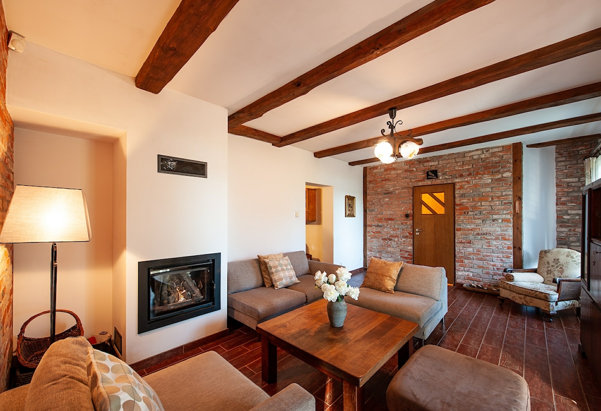 Dom z 1946r. (200 m²) znajduje się w małej, spokojnej wsi. Zachowany rustykalny, etniczny wystrój. 5 sypialni, 3 łazienki i przestronna weranda z widokiem na sad zapewniają pełen relaks i komfortowy pobyt 16 osobom. Duża w pełni wyposażona kuchnia utrzymana w wiejskim stylu jest równocześnie wyposażona we wszelkie nowoczesne sprzęty. Dom ma centralne ogrzewanie oraz klimatyczne piece kaflowe. Teren ogrodzony, parking, taras pergolami, z miejsce na ognisko, duży sad i boisko do siatkówki.