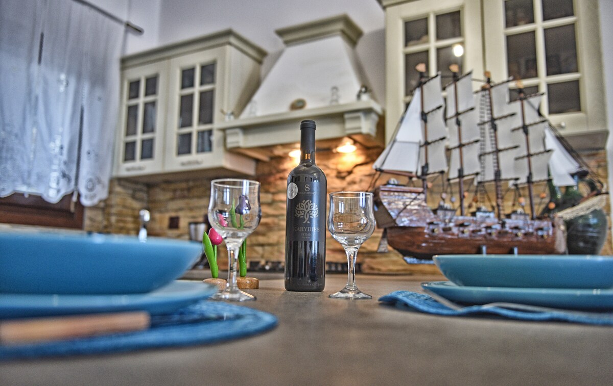 Das traditionelle Steinhaus grenzt an einer Seite an die natürliche Felswand. Das Bad ist ganz in den Fels hinein gebaut. Das ergibt ein ganz spektakuläres Wohngefühl und den Eindruck, mitten in der Natur zu sein. Die Terrasse hat eine wunderschöne Aussicht auf das Meer, den Strand von Fytema und die Berge von Messaria. Die Wohnung ist 2023 mit ökologischen Materialien im traditionellen Stil ausgebaut worden. Zum Strand sind es nur 200 m.
