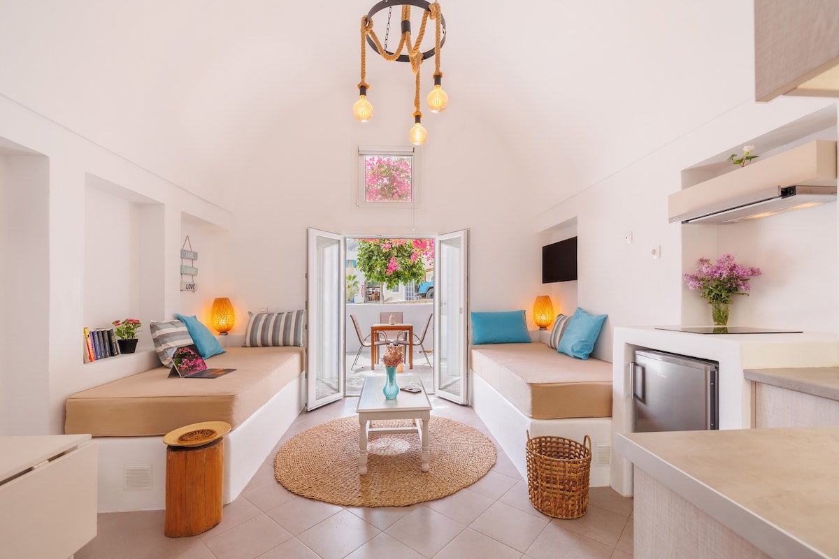 Hébergement traditionnel à Kamari-Santorini entièrement rénové en 2018 entouré d'un ancien grand bougainvillier. À seulement 500 mètres de la célèbre plage noire et à quelques pas des restaurants, bars et commerces. Le quartier est de style traditionnel principalement parmi les habitants. Notre maison est idéale pour familles avec enfants et couples. Propre, simple et fonctionnel fait avec amour pour vous
